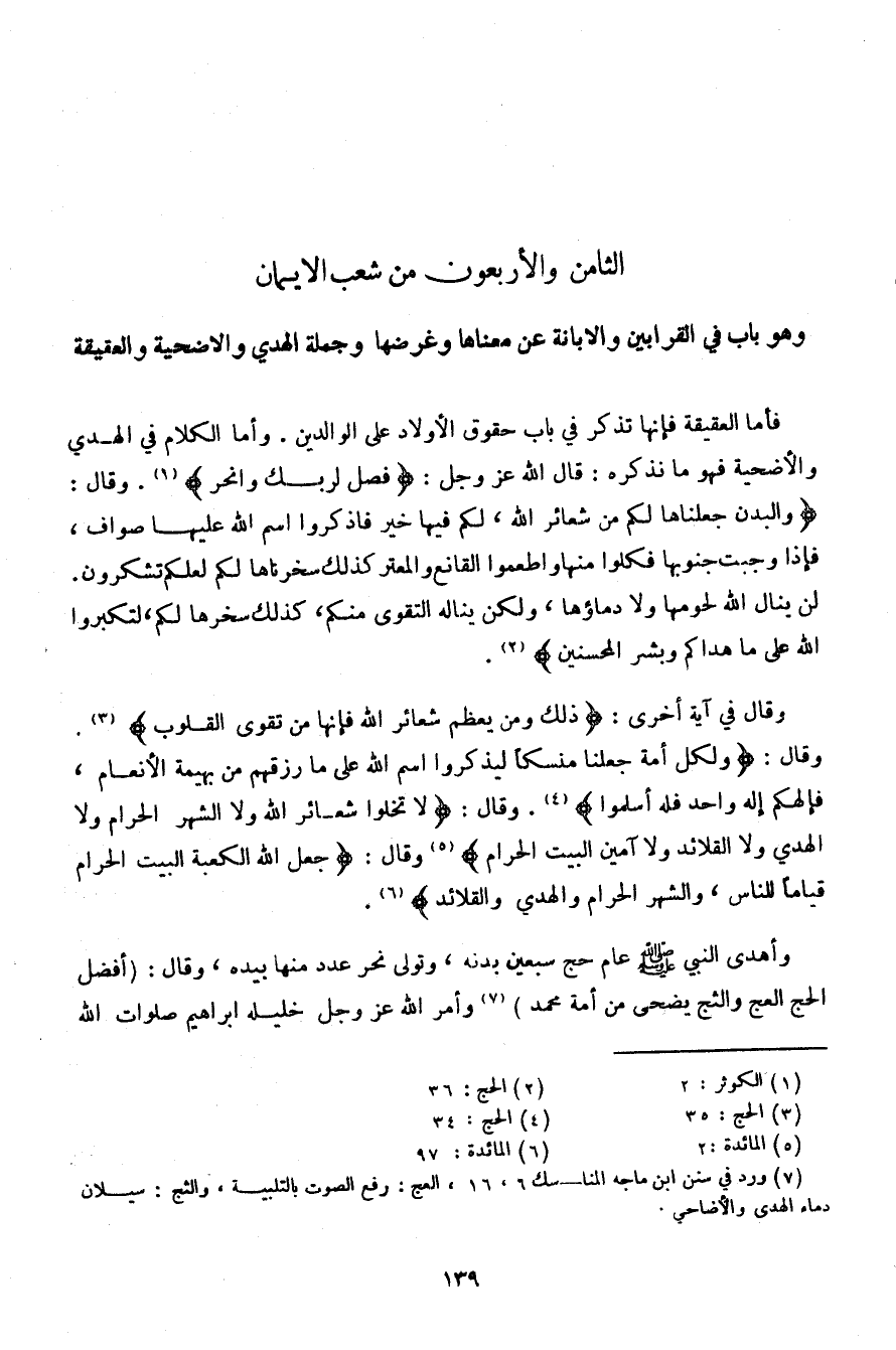 وقال في آية أخرى: {ذلك ومن يعظم شعائر الله فإنها من تقوى القلوب}. وقال: {ولكل أمة جعلنا منسكًا ليذكروا اسم الله على ما رزقهم من بهيمة الأنعام، فإلهكم إله واحد فله أسلموا}. وقال: {لا تخلوا شعائر الله ولا الشهر الحرام ولا الهدي ولا القلائد ولا آمين البيت الحرام} وقال: {جعل الله الكعبة البيت الحرام قيامًا للناس، والشهر الحرام والهدي والقلائد}.