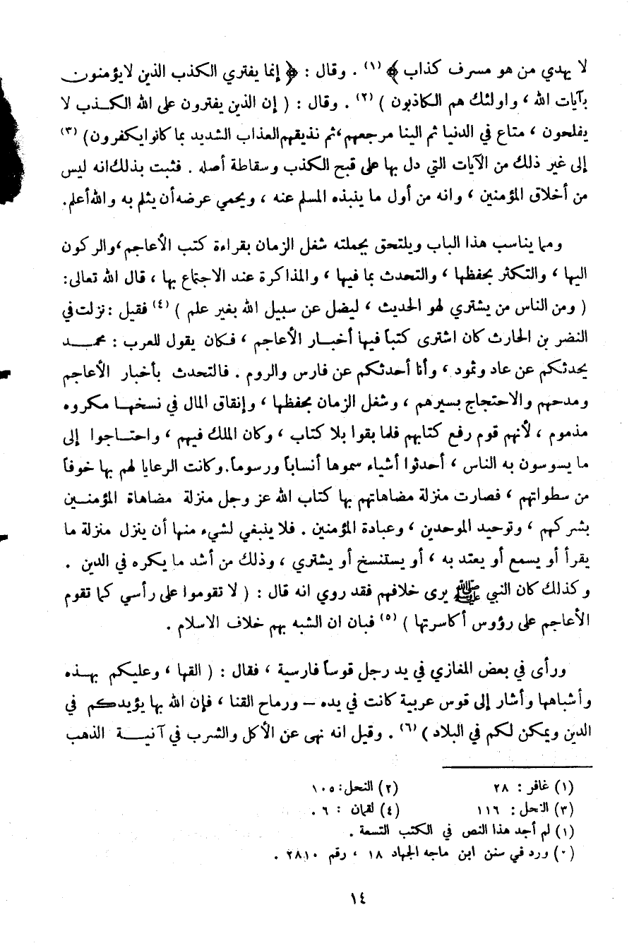 ومما يناسب هذا البااب ويلتحق بجملته شغل الزمان بقراءة كتاب الأعاجم، والركون إليها، والتكثر بحفظها، والتحدث بما فيها، والمذاكرة عند الاجتماع بها، قال الله تعالى:} ومن الناس من يشتري لهو الحديث، ليضل عن سبيل الله بغير علم {فقيل: نزلت في النصر بن الحارث كان اشترى كتبا فيها أخبار الأعاجم، فكان يقول للعرب: محمد يحدثكم عن عاد وثمود، وأنا أحدثكم عن فارس والروم. فالتحدث بأخبار الأعاجم ومدحهم والاحتجاج بسيرهم، وشغل الزمان بحفظها، وإنفاق المال في نسخها مكروه مذموم، لأنهم قوم رفع ككتابهم فلما بقوا بلا كتاب، وكان الملك فيهم، واحتاجوا إلى ما يسوسون له الناس، أحدثوا أشياء سموها أنسابا ورسوما. وكانت الرعايا لهم بها خوفا من سطواتهم، فصارت منزلة مضاهاتهم بها كتاب لله عز وجل منزلة مضاهاة المؤمنين بشركهم، وتوحيد الموحدين، وعبادة المؤمنين. فلا ينبغي لشيء منها أن ينزل منزلة ما يقرأ أو يسمع أو يعتد به، أو يستنسخ أو يشترى، وذلك من أشد ما يكره في الدين. وكذلك كان النبي صلى الله عليه وسلم يرى خلافهم فقد روي أنه قال:) لا