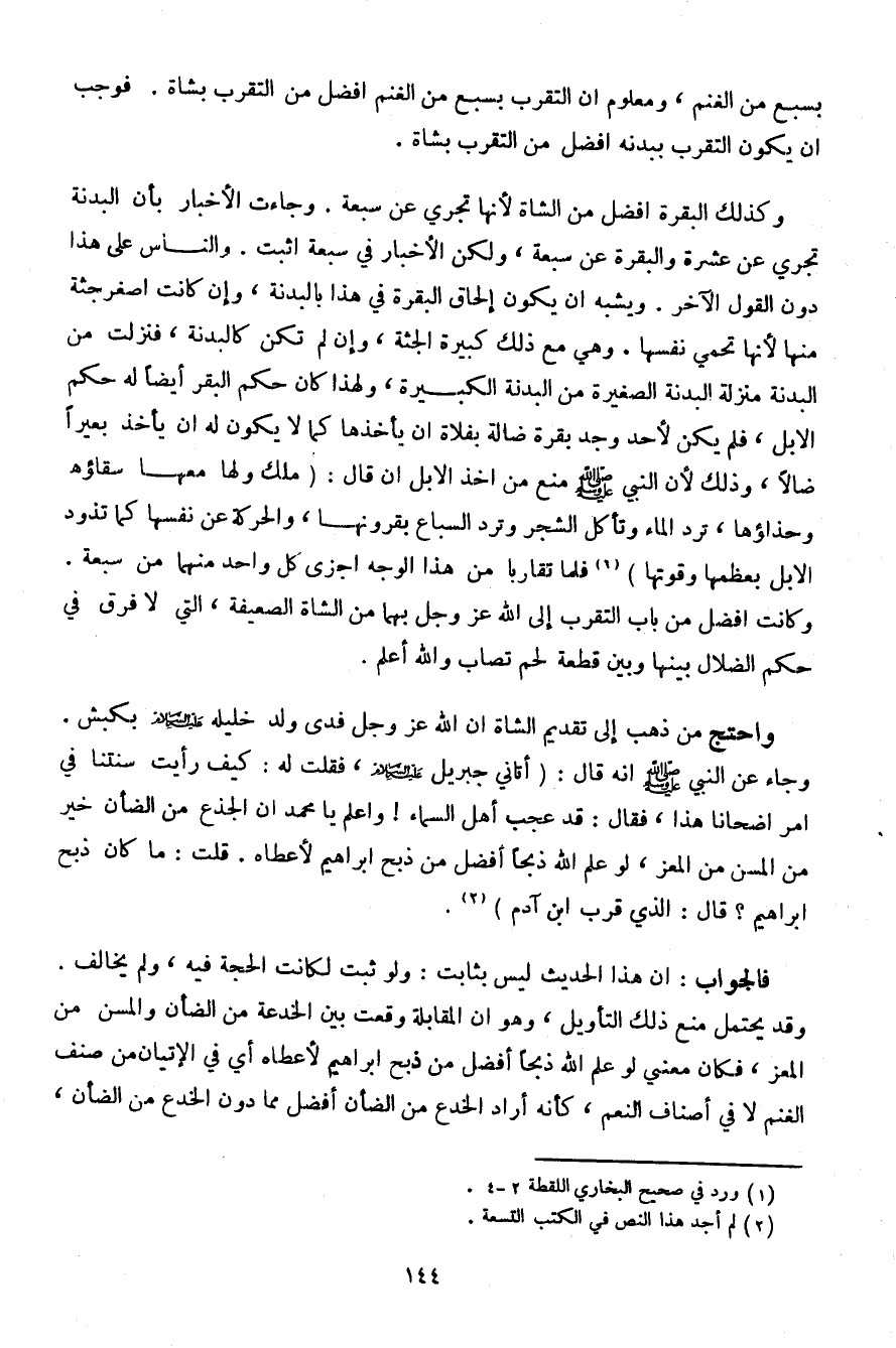 واحتج من ذهب إلى تقديم الشاة أن الله عز وجل فدى ولد خليله عليه السلام بكبش. وجاء عن النبي صلى الله عليه وسلم أنه قال: (أتاني جبريل عليه السلام، فقلت له: كيف رأيت سنتنا في أمر أضحانا هذا، فقال: قد عجب أهل السماء! واعلم يا محمد أن الجذع من الضأن خير من المسن من المعز، لو علم الله ذبحًا أفضل من ذبح إبراهيم لأعطاه. قلت: ما كان ذبح إبراهيم؟ قال: الذي قرب ابن آدم).