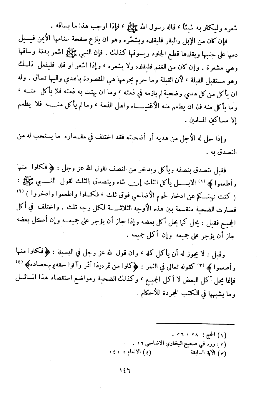 فإن كان من الإبل والبقر فليقلده ويشعره وهو أن ينزع صفحة سنامها الأيمن فيسيل دمها على جنبها ويقلدها قطع الجلود ويسوقها كذلك. فإن النبي صلى الله عليه وسلم أشعر بدنه وساقها وهي مشعرة. وإن كان من الغنم فليقلده ولا يشعره، وإذا أشعر أو قلد فليفعل ذلك وهو مستقبل القبلة، لأن القبلة وما حرم بحرمها هي المقصودة بالهدي وإليها تساق. وله أن يأكل من كل هدي وضحية لم يلزمه في ذمته، وما أن بهتت به ذمته فلا يأكل منه، وما يأكل منه فله أن يطعم من الأغنياء وأهل الذمة، وما لم يأكل منه فلا يطعم إلا مساكين المسلمين.