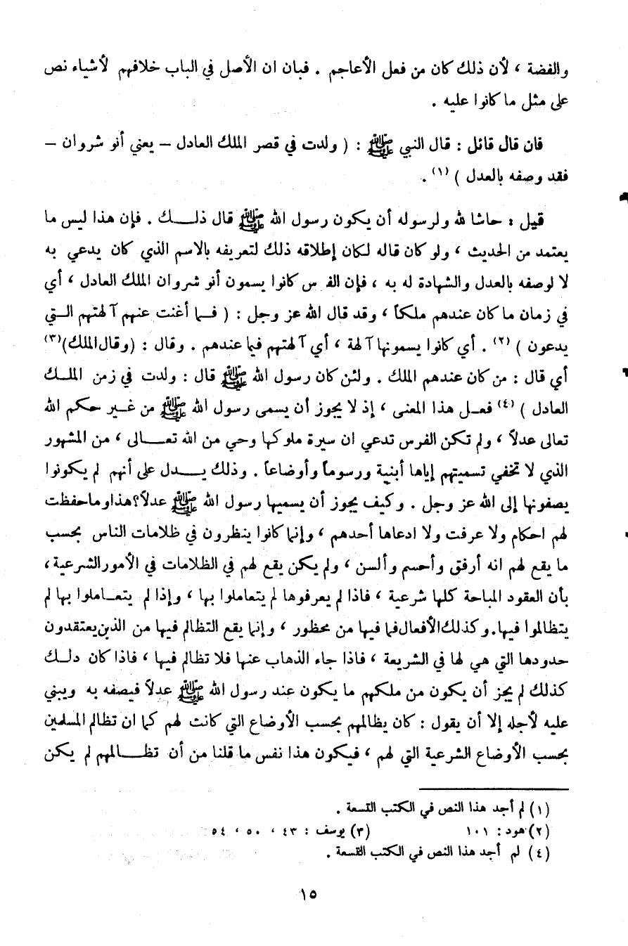 قيل: حاشا لله ولرسوله أن يكون رسول الله صلى الله عليه وسلم قال ذلك. فإن هذا ليس ما يعتمد من الحديث، ولو كان قاله لكان إطلاقه ذلك لتعريفه بالاسم الذي كان يدعى به لا لوصفه بالعدل والشهادة له به، فإن الفرس كانوا يسمون أنو شروان الملك العادل، أي في زمان ما كان عندهم ملكا، وقد قال الله عز وجل:} فما أغنت عنهم آلهتهم التي يدعون {. أي كانوا يسمونها آلهة، أي آلهتهم فيما عندهم. وقال: (وقال الملك) أي قال: من كان عندهم الملك. ولئن كان رسول الله صلى الله عليه وسلم قال: ولدت في زمن الملك العادل) فعل هذا المعنى، إذ لا يجوز أن يسمى رسول الله صلى الله عليه وسلم من غير حكم الله تعالى عدلا، ولم تكن الفرس تدعي أن سيرة ملوكها وحي من الله تعالى، من المشهور الذي لا تخفى تسميتهم إياها أبنية ورسوما وأوضاعا. وذلك يدل على أنهم لم يكونوا يصفونها إلى الله عز وجل. وكيف يجوز أن يسميها رسول الله صلى الله عليه وسلم عدلا؟ هذا وما حفظت لهم أحكام ولا عرفت ولا إدعاها أحدهم، وإنما كانوا ينظرون في ظلامات الناس بحسب ما يقع لهم أنه أرفق وأحسم وألسن، ولم يكن يقع لهم في الظلامات في الأمور الشرعية، بأن العقود المباحة كلها شرعية، فإذا لم يعرفوها لم يتعاملوا بها، وإذا لم يتعاملوا به لم يتظالموا فيها. وكذلك الأفعال فما فيها محظور، وإنما يقع التظالم فيها من الذين يعتقدون حدودها التي هي لها في الشريعة، فإذا جاء الذهاب عنه فلا تظالم فيها، فإذا كان ذلك كذلك لم يجز أن يكون من ملكهم ما يكون عند رسول الله صلى الله عليه وسلم عدلا فيصفه به ويبني عليه لأجله إلا أن يقول: كان يظالمهم بحسب الأوضاع التي كانت لهم كما أن تظالم المسلمين بحسب الأوضاع الشرعية التي لهم، فيكون هذا نفس ما قلنا من أن تظالمهم لم يكن