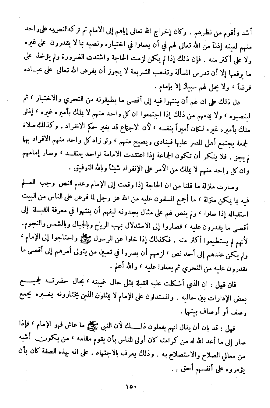 وصارت منزلة ما قلنا من أن الحاجة إذا وقعت إلى الإمام وعدم النص وجب العلم فيه بما يمكن منزلة، ما أجمع المسلمون عليه من الله عز وجل لما فرض على الناس من البيت استقباله إذا صلوا، ولم ينص لهم على مثال يجدونه ليفهم أن ينتهوا في معرفة القبلة إلى أقصى ما يقدرون عليه، فصاروا إلى الاستدلال بمهب الرياح وبالجبال وبالشمس والنجوم. لأنهم لم يستطيعوا أكثر منه. فكذلك إذا خلوا عن الرسول صلى الله عليه وسلم واحتاجوا إلى الإمام، ولم يكن عندهم إلى أحد نص، لزمهم أن يصروا في تعيين من يتولى أمرهم إلى أقصى ما يقدرون عليه من التحري ثم يعملوا عليه، والله أعلم.