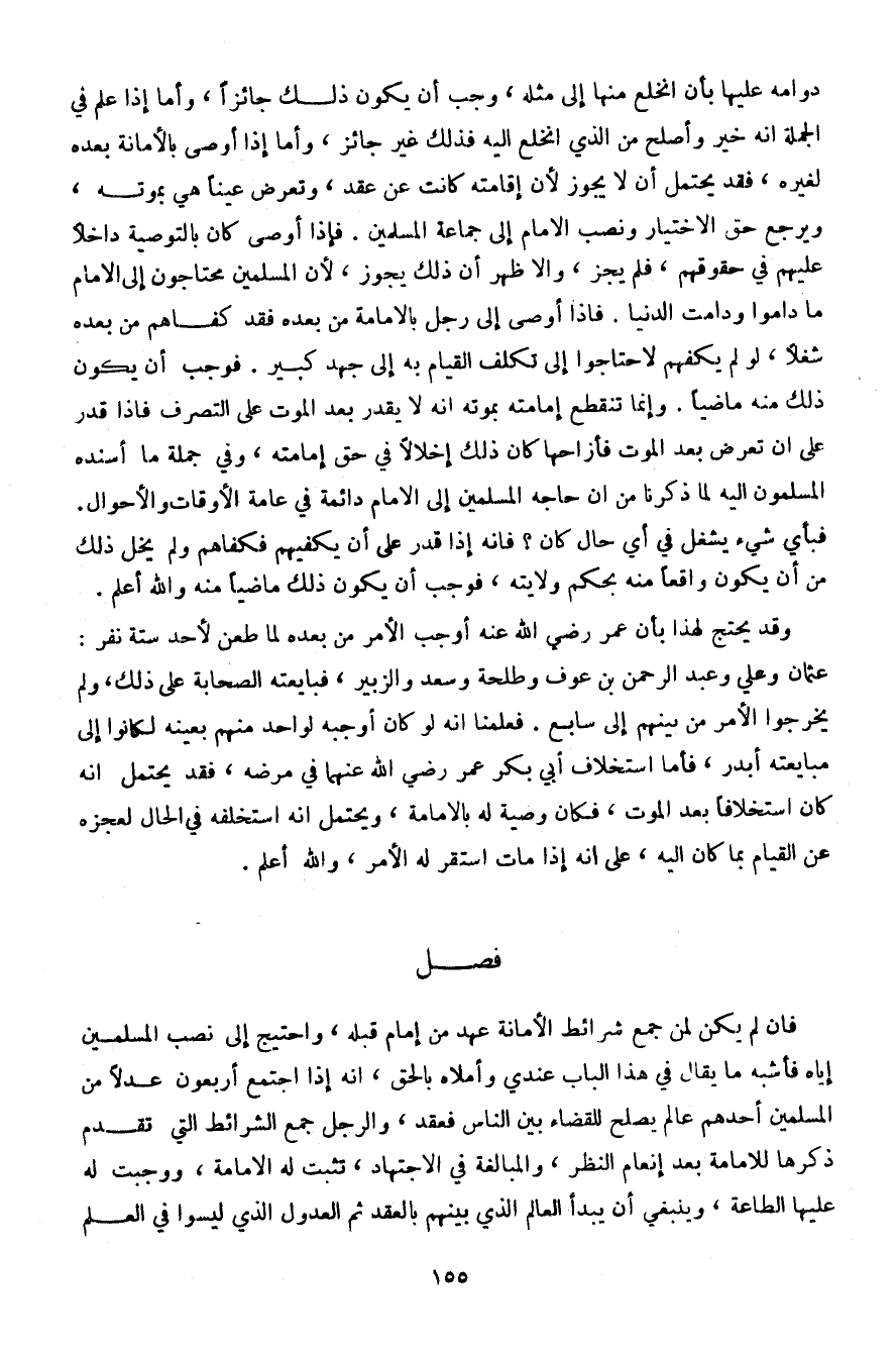 دوامه عليها بأن انخلع منها إلى مثله، وجب أن يكون ذلك جائزًا، وأما إذا علم في الجملة أنه خير وأصلح من الذي انخلع إليه فذلك غير جائز، وأما إذا أوصى بالأمانة بعده لغيره، فقد يحتمل أن لا يجوز لأن إقامته كانت عن عقد، وتعرض عينًا هي بموته، ويرجع حق الاختيار ونصب الإمام إلى جماعة المسلمين. فإذا أوصى كان بالتوصية داخلًا عليهم في حقوقهم، فلم يجز، وإلا ظهر أن ذلك يجوز، لأن المسلمين محتاجون إلى الإمام ما داموا ودامت الدنيا. فإذا أوصى إلى رجل بالإمامة من بعده فقد كفاهم من بعده شغلًا، لو يم يكفهم لاحتاجوا إلى تكلف القيام به إلى جهد كبير. فوجب أن يكون ذلك منه ماضيًا. وإنما انقطع إمامته بموته أنه لا يقدر بعد الموت على التصرف فإذا قدر على أن تعرض بعد الموت فأزاحها كان ذلك إخلالًا في حق إمامته، وفي جملة ما أسنده المسلمون إليه لما ذكرنا من أن حاجة المسلمين إلى الإمام دائمة في عامة الأوقات والأحوال. فبأي شيء يشغل في أي حال كان؟ فإنه إذا قدر على أن يكفيهم فكفاهم ولم يخل ذلك من أن يكون واقعًا منه بحكم ولايته، فوجب أن يكون ذلك ماضيًا منه والله أعلم.