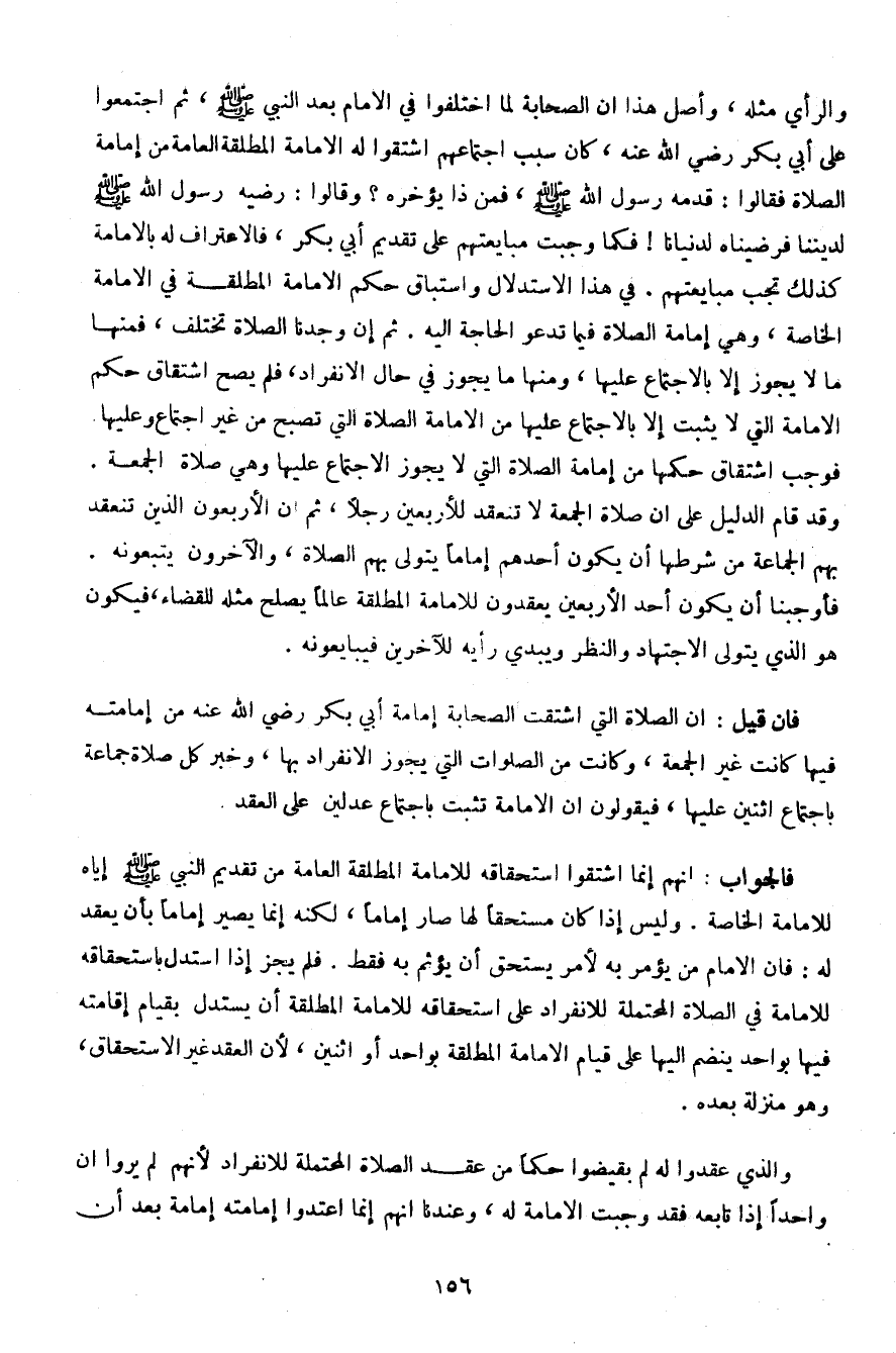 والرأي مثله، وأصل هذا أن الصحابة لما اختلفوا في الإمام بعد النبي صلى الله عليه وسلم، ثم اجتمعوا على أبي بكر رضي الله عنه، كان سبب اجتماعهم اشتقوا له الإمامة المطلقة العامة من إمامة الصلاة فقالوا: قدمه رسول الله صلى الله عليه وسلم، فمن ذل يؤخره؟ وقالوا: رضيه رسول الله صلى الله عليه وسلم لديننا فرضيناه لدنيانا! فكما وجبت مبايعتهم على تقديم أبي بكر، فالاعتراف له بالإمامة كذلك تجب مبايعتهم. في هذا الاستدلال واستباق حكم الإمامة المطلقة في الإمامة الخاصة، وهي إمامة الصلاة فيما تدعو الحاجة إليه. ثم إن وجدنا الصلاة تختلف، فمنها ما لا يجوز إلا بالاجتماع عليها، ومنها ما يجوز في حال الانفراد، فلم يصح اشتقاق حكم الإمامة التي لا يثبت إلا بالاجتماع عليها من الإمامة الصلاة التي تصبح من غير اجتماع وعليها وجب الاشتقاق حكمها من إمامة الصلاة التي لا يجوز الاجتماع عليها وهي صلاة الجمعة. وقد قام الدليل على أن صلاة الجمعة لا تنعقد للأربعين رجلًا، ثم إن الأربعون الذين تنعقد بهم الجماعة من شرطها أن يكون أحدهم إمامًا يتولى بهم الصلاة، والآخرون يتبعونه. فأوجبنا أن يكون أحد الأربعين يعقدون للإمامة المطلقة عالمًا يصلح مثله للقضاء، فيكون هو الذي يتولى الاجتهاد والنظر ويبدي رأيه للآخرين فيبايعونه.