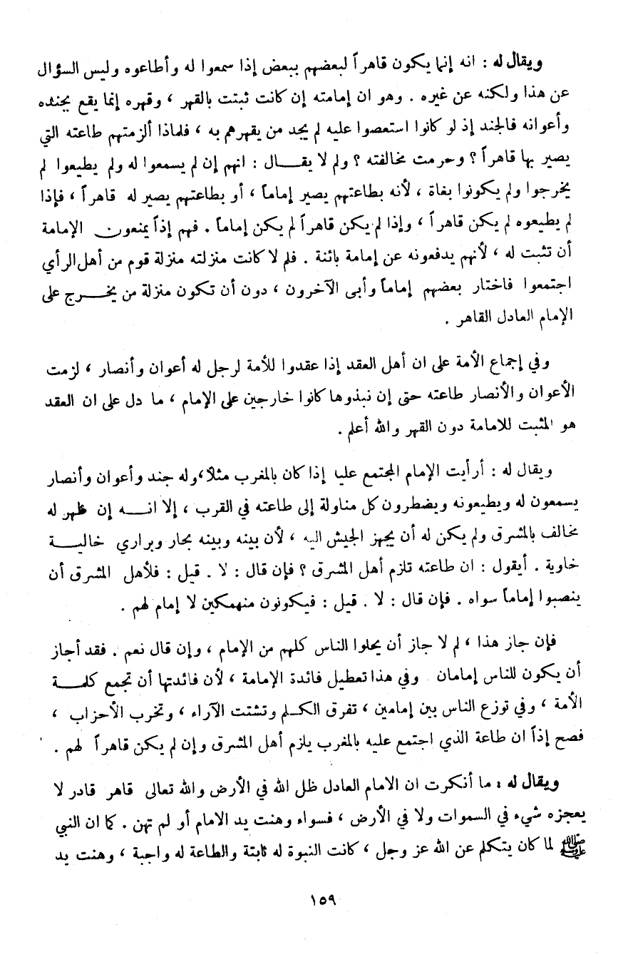 فإن جاز هذا، لم لا جاز أن يحلوا الناس كلهم من الإمام، وإن قال نعم. فقد أجاز أن يكون للناس إمامان وفي هذا تعطيل فائدة الإمامة، لأن فائدتها أن تجمع كلمة الأمة، وفي توزع الناس بين إمامين، تفرق الكلم وتشتت الآراء، وتخرب الأحزاب، فصح إذًا أن طاعة الذي اجتمع عليه بالمغرب يلزم أهل المشرق وإن لم يكن قاهرًا لهم.