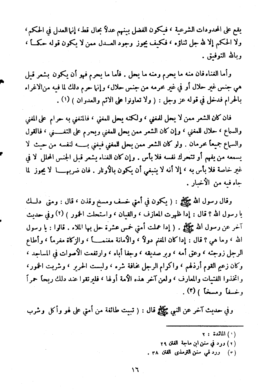 وقال رسول الله صلى الله عليه وسلم: (يكون في أمتي خسف ومسخ وقذن، قال: ومتى ذلك يا رسول الله؟ قال: إذا ظهرت المعازف، والقيان، واستحلت الخمور) وفي حديث آخر عن رسول الله صلى الله عليه وسلم. (إذا عملت أمتي خمس عشرة حل بها الملاء. قالوا: يا رسول الله، وم هي؟ قل: إذ كان المغنم دولا، والأمانة مغنما، والزكاة مغرما، وأطاع الرجل زوجته، وعتق أمه، وبر صديقه، وجفا أباه، وارتفعت الأصوات في المساجد، وكان زعيم القوم أرذلهم، وإكرام الرجل مخافة شره، ولبست الحرير، وشربت الخمور، واتخذوا الفتيات والمعارف، ولعن آخر هذه الأمة أولها، فليرتقوا عند ذلك ريحا حمرا وخسفا ومسخا).