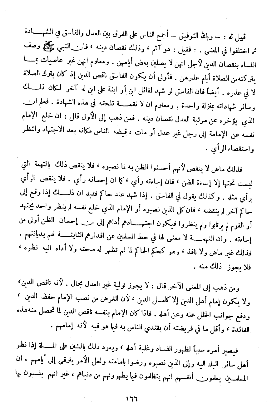 قيل له: -وبالله التوفيق- أجمع الناس على الفرق بين العدل والفاسق في الشهادة ثم اختلفوا في المعنى. فقيل: هو آثم، وذلك نقصان دينه، فإن النبي صلى الله عليه وسلم وصف النساء بنقصان الدين لأجل أنهن لا يصلين بعض أيامهن. ومعلوم أنهن غير عاصيات بما يتركنه من الصلاة أيام عذرهن. فأولى أن يكون الفاسق ناقص الدين إذا كان يترك الصلاة لا في عذره. أيضًا فإن الفاسق لو شهد لقائل ابن أو ابنة على ابن له آخر لكان ذلك وسائر شهاداته بمنزلة واحدة. ومعلوم أن لا نقمة تلحقه في هذه الشهادة. فعلم أن الذي يؤخره عن مرتبة العدل نقصان دينه. فمن ذهب إلى الأول قال: أن خلع الإمام نفسه عن الإمامة إلى رجل غير عدل أو مات، قيضه الناس مكانه بعد الاجتهاد والنظر واستقصاء الرأي.