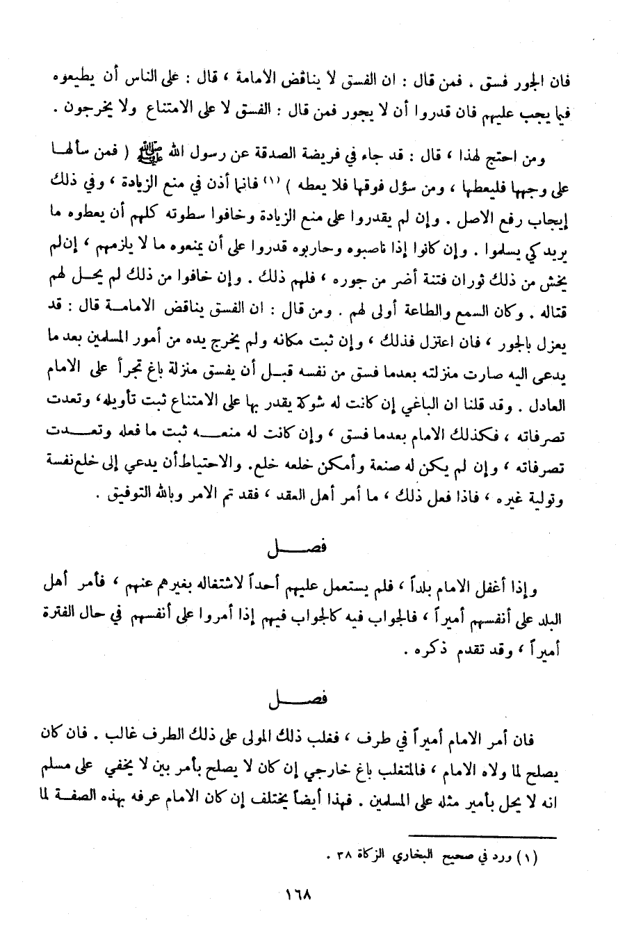 ومن احتج لهذا، قال: قد جاء في فريضة الصدقة عن رسول الله صلى الله عليه وسلم (فمن سألها على وجهها فليعطها، ومن سؤل فوقها فلا يعطه) فإنما أذن في منع الزيادة، وفي ذلك إيجاب رفع الأصل. وإن لم يقدروا على منع الزيادة وخافوا سطوته كلهم أن يعطوه ما يريد كي يسلموا. وإن كان إذا ناصبوه وحاربوه قدروا على أن يمنعوه ما لا يلزمهم، إن لم يخش من ذلك ثوران فتنة أضر من جوره، فلهم ذلك. وإن خافوا من ذلك لم يحل لهم قتاله. وكان السمع والطاعة أولى لهم. ومن قال: إن الفسق يناقض الإمامة قال: قد يعزل بالجور، فإن اعتزل فذلك، وإن ثبت مكانه ولم يخرج يده من أمور المسلمين بعد ما يدعى إليه صارت منزلته بعدما فسق من نفسه قبل أن يفسق منزلة باغ تجرأ على الإمام العادل. وقد قلنا أن الباغي إن كانت له شوكة يقدر بها على الامتناع ثبت تأويله، وتعدت تصرفاته، فكذلك الإمام بعدما فسق، وإن كانت له منعه ثبت ما فعله وتعدت تصرفاته، وإن لم يكن له صنعة وأمكن خلعه خلع. والاحتياط أن يدعي إلى خلع نفسه وتولية غيره، فإذا فعل ذلك، ما أمر أهل العقد، فقد تم الأمر وبالله التوفيق.