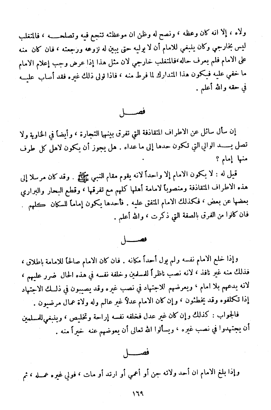 قيل له: لا يكون الإمام إلا واحدًا لأنه يقوم مقام النبي صلى الله عليه وسلم. وقد كان مرسلا إلى هذه الأطراف المتقاذفة ومنصوبًا لإمامة أهلها كلهم مع تفرقها، وقطع البحار والبراري بعضها عن بعض، فكذلك الإمام المتفق عليه. فأحدها يكون إمامًا للسكان كلهم. فإن كانوا من الفرق بالصفة التي ذكرت، والله أعلم.