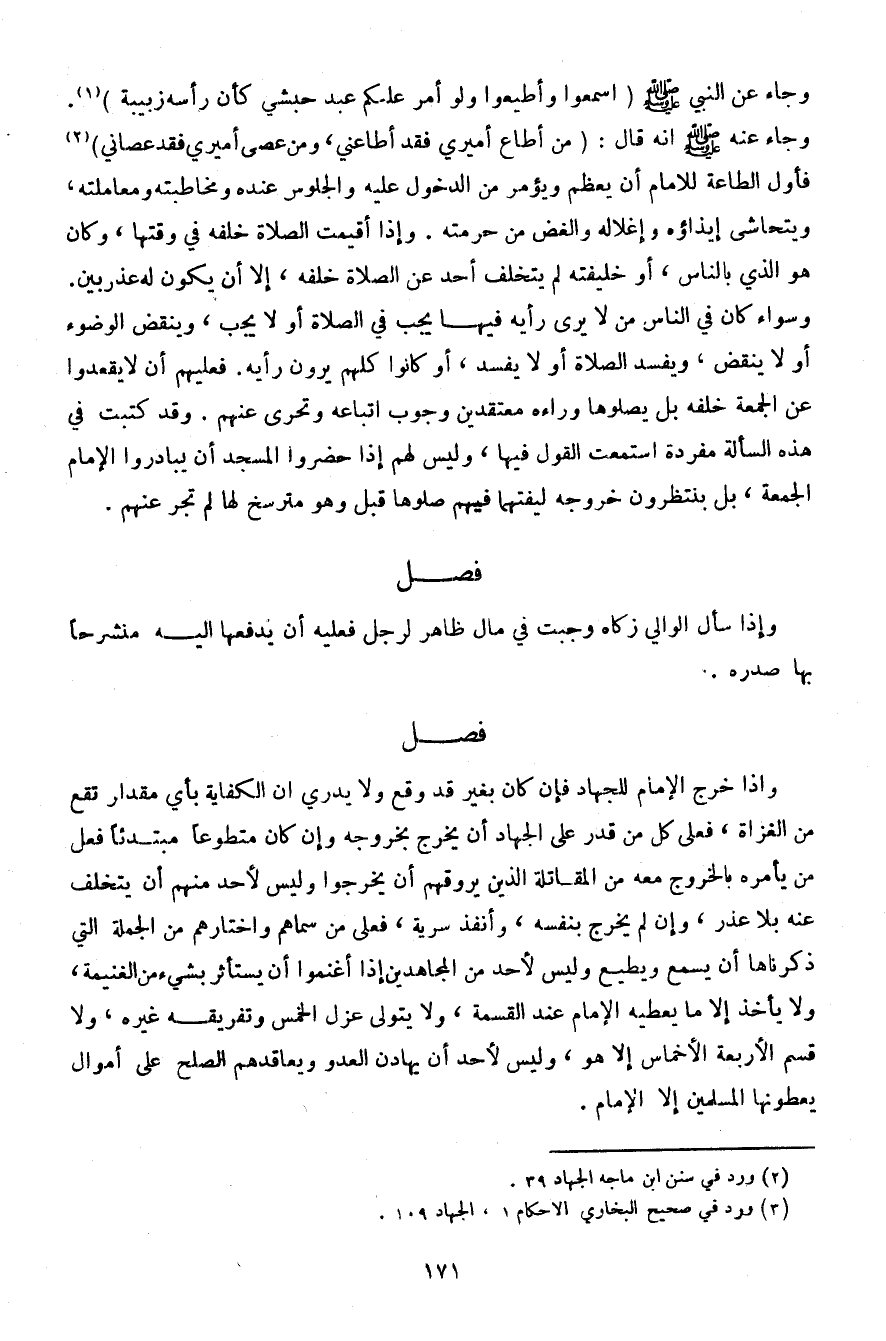 وجاء عن النبي صلى الله عليه وسلم (اسمعوا وأطيعوا ولو أمر عليكم عبد حبشي كأن رأسه زبيبة). وجاء عنه صلى الله عليه وسلم أنه قال: (من أطاع أميري فقد أطاعني، ومن عصى أميري فقد عصاني) فأول الطاعة للإمام أن يعظم ويؤمر من الدخول عليه والجلوس عنده ومخاطبته ومعاملته، ويتحاشى إيذاؤه وإغلاله والغض من حرمته. وإذا أقيمت الصلاة خلفه في وقتها، وكان هو الذي بالناس، أو خليفته لم يتخلف أحد عن الصلاة خلفه، إلا أن يكون له عذر بين. وسواء كان في الناس من لا يرى رأيه فيها يجب في الصلاة أو لا يجب، وينقض الوضوء أو لا ينقض، ويفسد الصلاة أو لا يفسد، أو كانوا كلهم يرون رأيه. فعليهم أن لا يقعدوا عن الجمعة خلفه بل يصلوها وراءه معتقدين وجوب اتباعه وتحرى عنهم. وقد كتبت في هذه المسألة مفردة استمعت القول فيها، وليس لهم إذا حضروا المسجد أن يبادروا الإمام الجمعة، بل ينتظرون خروجه يفتهما فيهم صلوها قبل وهو مترسخ لها لم تجر عنهم.