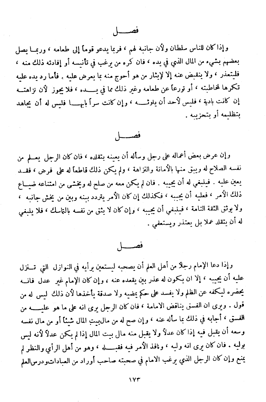 وإذا دعا الإمام رجلًا من أهل العلم أن يصحبه ليستعين برأيه في النوازل التي تنزل عليه أن يجيبه، إلا أن يكون له عذر بين يقعده عنه، وإن كان الإمام غير عدل فإنه يحضره ليكفه عن الظلم ولا يفسد على حكم يمضيه ولا صدقة يأخذها لأن ذلك ليس له من قول. ويرى أن الفسق يناقض الإمامة، فإن كان الرجل يرى أنه على ما هو عليه من الفسق، أجابه في ذلك بما سأله عنه، وإن صح له من مال بيت المال شيئًا أو من مال نفسه وسعه أن يقبل فيه إذا كان عدلًا ولا يقبل منه مال بيت المال إذا لم يكن عدلًا لأنه ليس بوليه. فإن كان يرى أنه وليه، ونافذ الأمر فيه فقبله، وهو من أهل الرأي والنظر لم يمنع وإن كان الرجل الذي يرغب الإمام في صحبته صاحب أوراد من العبادات ودرس العلم