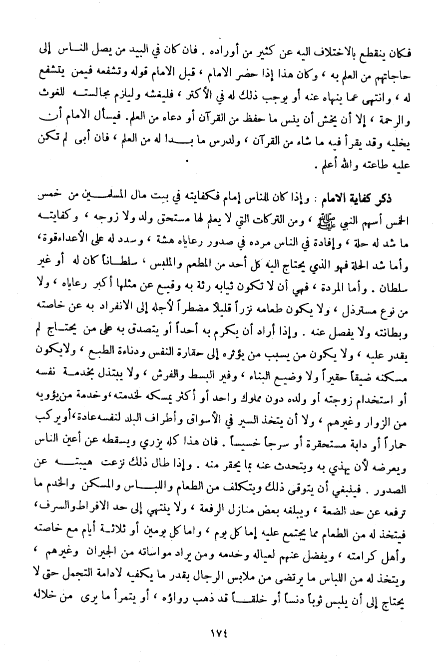 ذكر كفاية الإمام: وإذا كان للناس إمام فكفايته في بيت مال المسلمين من خمس الخمس أسهم النبي صلى الله عليه وسلم، ومن التركات التي لا يعلم لها مستحق ولد ولا زوجه، وكفايته ما شد له حلة، وإفادة في الناس مرده في صدور رعاياه هشة، وسدد له على الأعداء قوة، وأما شد الحلة فهو الذي يحتاج إليه كل أحد من المطعم والملبس، سلطانًا كان له أو غير سلطان. وأما المردة، فهي أن لا تكون ثيابه رثة به وقيع عن مثلها أكبر رعاياه، ولا من نوع مسترذل، ولا يكون طعامه نزرًا قليلًا مضطرًا لأجله إلى الإنفراد به عن خاصته وبطانته ولا يفصل عنه. وإذا أراد أن يكرم به أحدًا أو يتصدق به على من يحتاج لم يقدر عليه، ولا يكون من يسبب من يؤثره إلى حقارة النفس ودناءة الطبع، ولا يكون مسكنه ضيقًا حقيرًا ولا وضيع البناء، وفير البسط والفرش، ولا يبتذل بخدمة نفسه أو استخدام زوجته أو ولده دون مملوك واحد أو أكثر يمسكه لخدمته، وخدمة من يؤويه من الزوار وغيرهم، ولا أن يتخذ السير في الأسواق وأطراف البلد لنفسه عادة، أو يركب حمارًا أو دابة مستحقرة أو سرجًا خسيسًا. فإن هذا كله يزري ويسقطه عن أعين الناس ويعرضه لأن يهذي به ويتحدث عنه بما يحقر منه. وإذا طال ذلك نزعت هيبته عن الصدور. فينبغي أن يتوقى ذلك ويتكلف من الطعام واللباس والمسكن والخدم ما ترفعه عن حد الضمة، ويبلغه بعض منازل الرفعة، ولا ينتهي إلى حد الإفراط والسرف، فيتخذ له من الطعام مما يجتمع عليه إما كل يوم، وإما كل يومين أو ثلاثة أيام مع خاصته وأهل كرامته، ويفضل عنهم لعياله وخدمه من يراد مواساته من الجيران وغيرهم، ويتخذ له من اللباس ما يرتضى من ملابس الرجال بقدر ما يكفيه لإدامة التجميل حتى لا يحتاج إلى أن يلبس ثوبًا دنسًا أو خلقًا قد ذهب رواؤه، أو يتمرأ ما يرى من خلاله