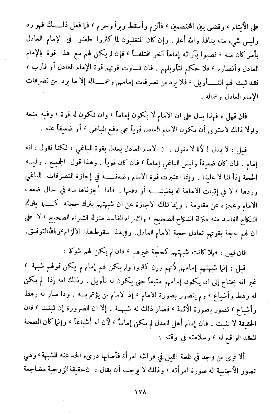 قيل: لا يدل! لأنا لا نقول: أن الإمام العادل يعدل بقوة الباغي، لكنا نقول: إنه إمام. فإن كان ضعيفًا وليس الباغي إمامًا، فإن كان قويًا. وهذا قول الجميع. وفيه الحجة إذًا لنا لا علينا. وإنما اعتبرت قوة الإمام وضعفه في إجازة التصرفات للباغي وردها، لا في إثبات الإمامة له بغلبته أو دفعها. فإذا أجزناها منه في حال ضعف الإمام وعجزه عن مقاومة. وإنما تلك الإجازة عن أن شبهتهم بترك حجته كما يترك النكاح الفاسد منه منزلة النكاح الصحيح، والشراء الفاسد منزلة الشراء الصحيح، لا على أن لهم حجة بقوتهم تعادل حجة الإمام العادل. وفي هذا سقوط هذا الإلزام، وبالله التوفيق.