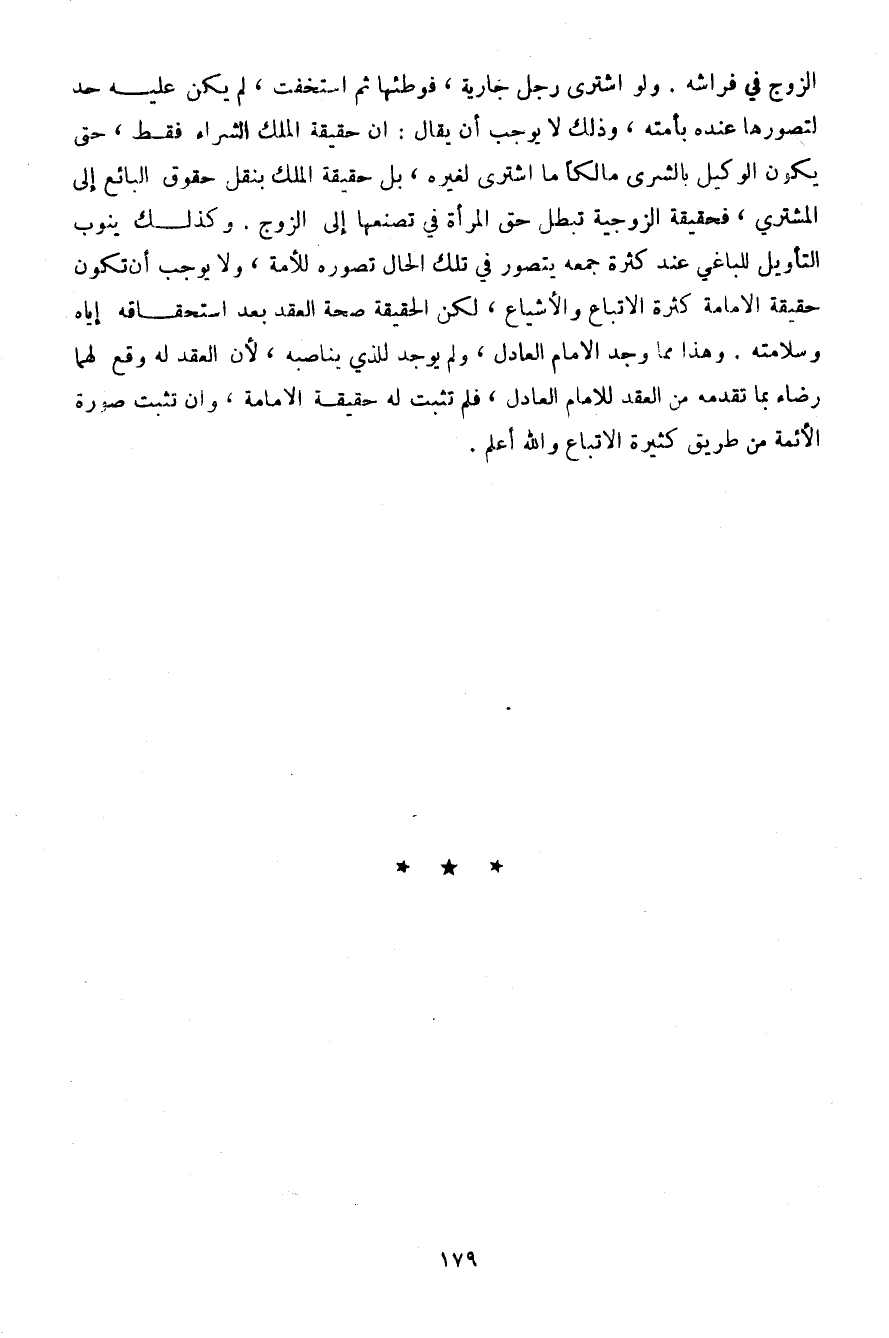 الزوج في فراشه. ولو اشترى رجل جارية، فوطئها ثم استخفت، لم يكن عليه حد لتصورها عنده بأمته، وذلك لا يوجب أن يقال: إن حقيقة الملك الشراء فقط، حق يكون الوكيل بالشرى مالكًا ما اشترى لغيره، بل حقيقة الملك بنقل حقوق البائع إلى المشتري، فحقيقة الزوجية تبطل حق المرأة في تصنعها إلى الزوج. وكذلك ينوب التأويل للباغي عند كثرة جمعه يتصور في تلك الحال تصوره للأمة، ولا يوجب أن تكون حقيقة الإمامة كثرة الأتباع والأشياع، لكن الحقيقة صحة العقد بعد استحقاقه إياه وسلامته. وهذا مما وجد الإمام العادل، ولم يوجد للذي يناصبه، لأن العقد له وقع لهما رضاء بما تقدمه من العقد للإمام العادل، فلم تثبت له حقيقة الإمامة، وأن تثبت صورة الأئمة من طريق كثيرة الاتباع والله أعلم.