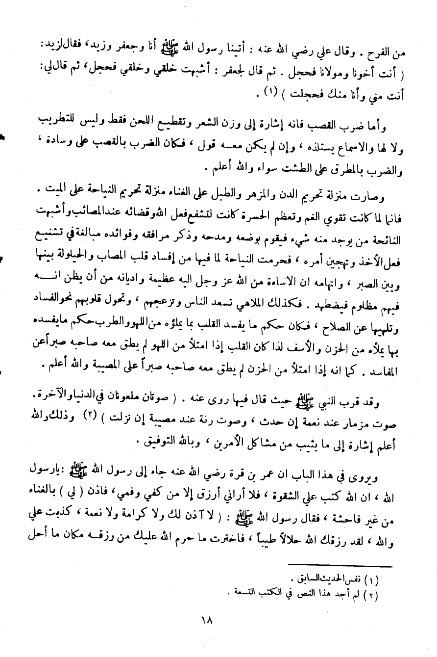 وقد قرب النبي صلى الله عليه وسلم حيث قل فيها روي عنه. (صوتان ملعون في الدنيا والآخرة). صوت مزمر عند نعمة إن حدث، وصوت رنة عند مصيبة إن نزلت) وذلك والله أعلم إشارة إلى ما يثيب من مشاكل الأمرين، وبالله التوفيق.