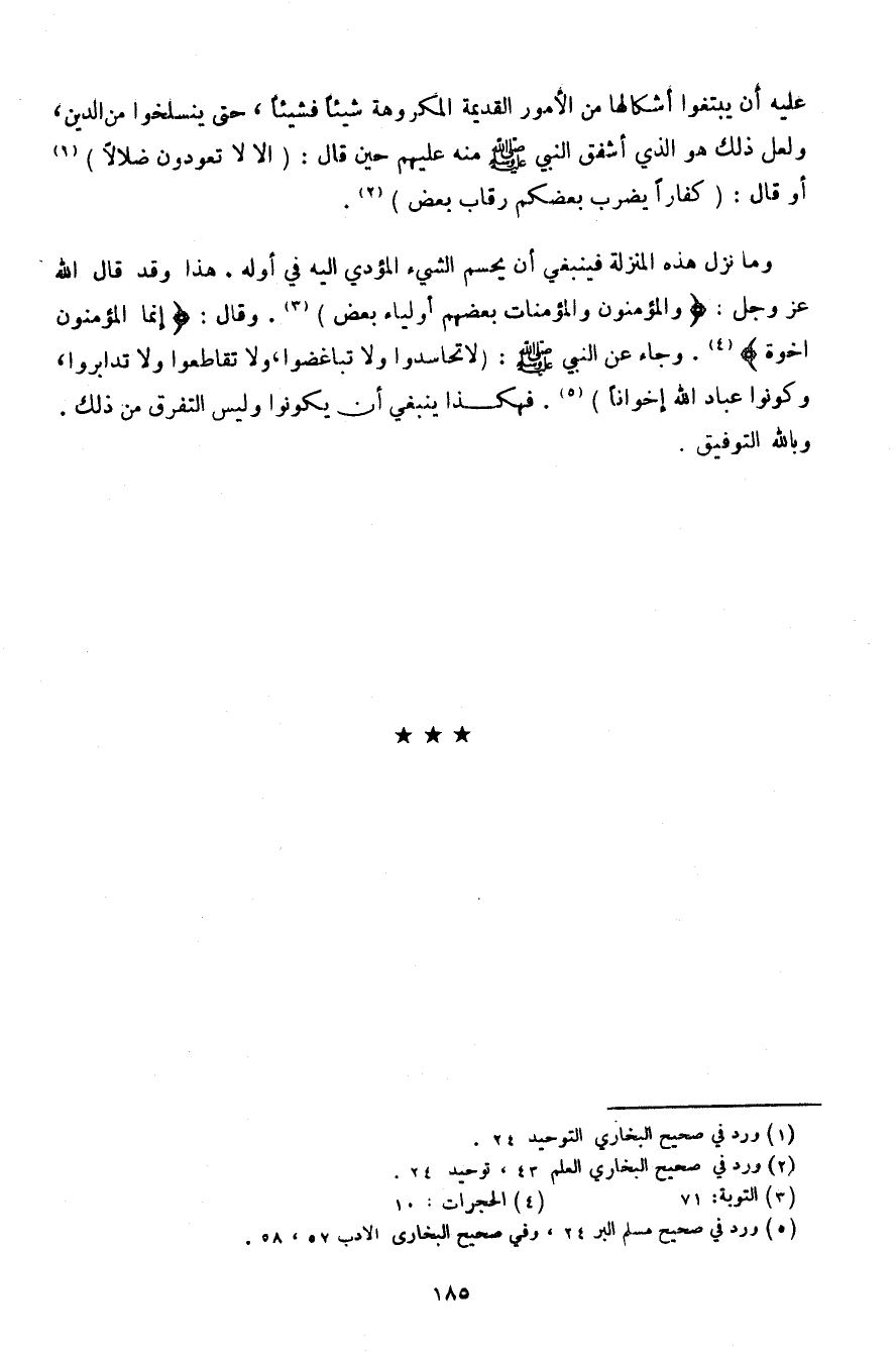 وما نزل هذه المنزلة فينبغي أن يحسم الشيء المؤدي إليه في أوله. هذا وقد قال الله عز وجل: {والمؤمنون والمؤمنات بعضهم أولياء بعض}. وقال: {إنما المؤمنون إخوة}. وجاء عن النبي صلى الله عليه وسلم: (لا تحاسدوا ولا تباغضوا، ولا تقاطعوا ولا تدابروا، وكونوا عباد الله إخوانًا). فهكذا ينبغي أن يكونوا وليس التفرق من ذلك. وبالله التوفيق.