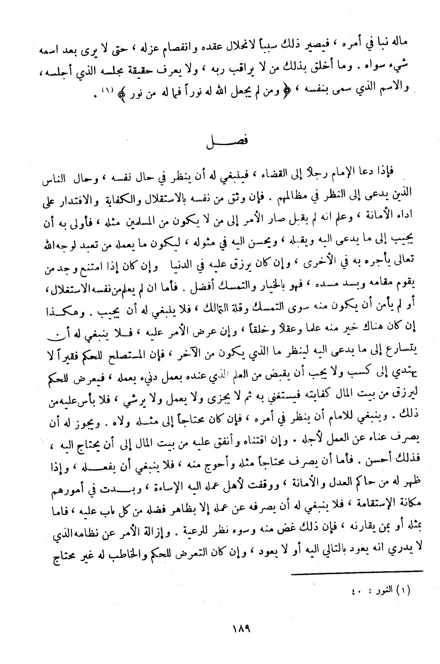 فإذا دعا الإمام رجلًا إلى القضاء، فينبغي له أن ينظر في حال نفسه، وحال الناس الذين يدعى إلى النظر في مظالمهم. فإن وثق من نفسه بالاستقلال والكفاية والاقتدار على أداء الأمانة، وعلم أنه لم يقبل صار الأمر إلى من لا يكون من المسلمين مثله، فأولى به أن يجيب إلى ما يدعى إليه ويقبله، ويحسن إليه في مثوله، ليكون ما يعمله من تعبد لوجه الله تعالى بأجره به في الأخرى، وإن كان يرزق عليه في الدنيا وإن كان إذا امتنع وجد من يقوم مقامه ويسد مسده، فهو بالخيار والتمسك أفضل. فأما إن لم يعلم من نفسه الاستغلال، أو لم يأمن أن يكون منه سوى التمسك وقلة التمالك، فلا ينبغي له أن يجيب. وهكذا إن كان هناك خير منه علما وعقلًا وخلقًا، وإن عرض الأمر عليه، فلا ينبغي له أن يتسارع إلى ما يدعى إليه لينظر ما الذي يكون من الآخر، فإن المستصلح للحكم فقيرًا لا يهتدي إلى كسب ولا يجب أن يقبض من العلم الذي عنده بعمل دنيء يعمله، فيعرض للحكم ليرزق من بيت المال كفايته فيستغني به ثم لا يجزى ولا يعمل ولا يرشي، فلا بأس عليه من ذلك. وينبغي للإمام أن ينظر في أمره، فإن كان محتاجًا إلى مثله ولاه. ويجوز له أن يصرف عناء عن العمل لأجله. وإن اقتناه وأنفق عليه من بيت المال إلى أن يحتاج إليه، فذلك أحسن. فأما أن يصرف محتاجًا مثله وأحوج منه، فلا ينبغي أن يفعله، وإذا ظهر له من حاكم العدل والأمانة، ووقفت لأهل عمله إليه الإساءة، وبدت في أمورهم مكانة الاستقامة، فلا ينبغي له أن يصرفه عن عمله إلا بظاهر فضله من كل باب عليه، فأما بمثله أو بمن يقارنه، فإن ذلك غض منه وسوء نظر للرعية. وإزالة الأمر عن نظامه الذي لا يدري أنه يعود بالتالي إليه أو لا يعود، وإن كان التعرض للحكم والخاطب له غير محتاج