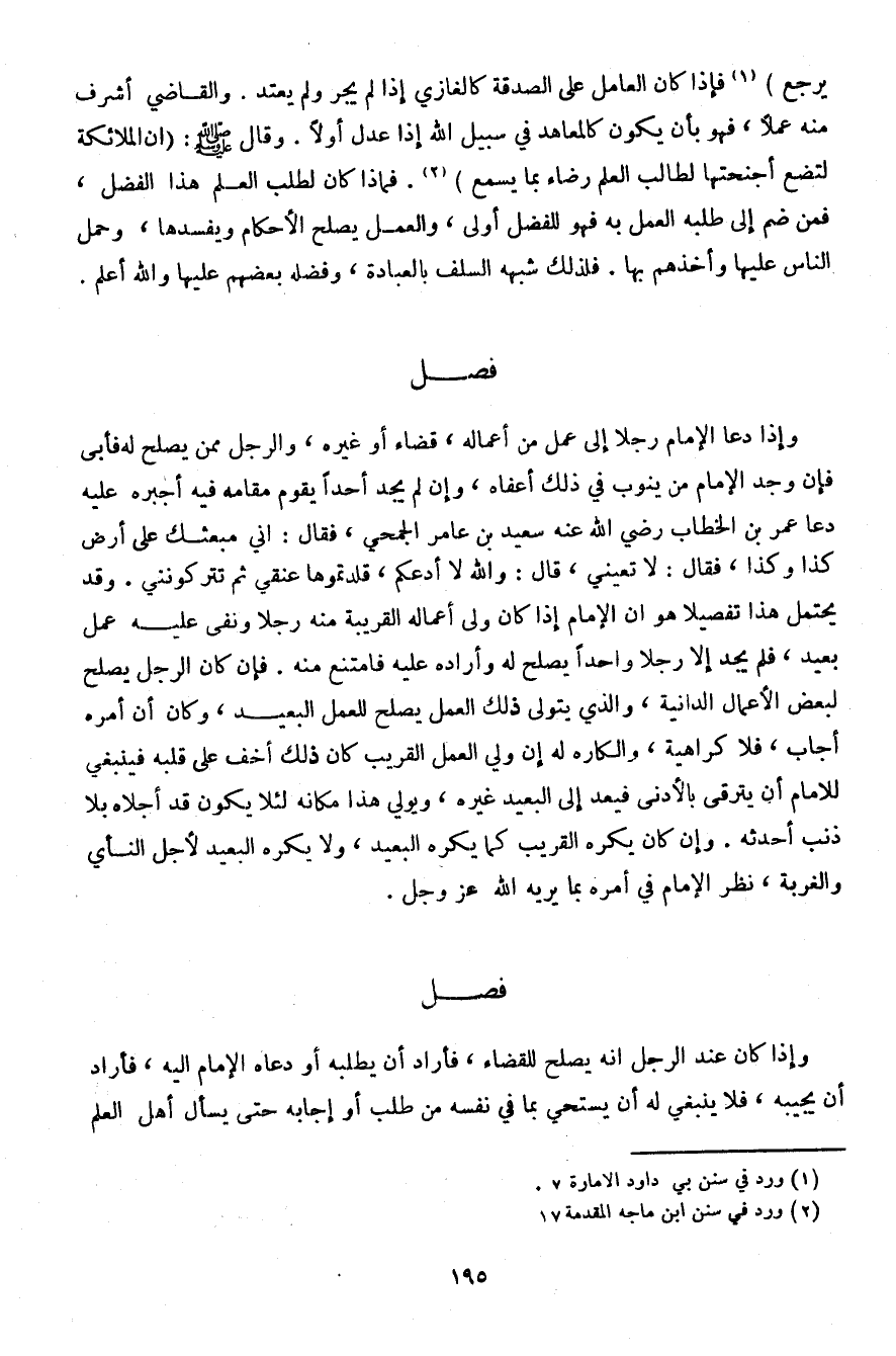 يرجع) فإذا كان العامل على الصدقة كالغازي إذا لم يجر ولم يعتد. والقاضي أشرف منه عملًا، فهو بأن يكون كالمعاهد في سبيل الله إذا عدل أولًا. وقال صلى الله عليه وسلم: (إن الملائكة لتضع أجنحتها لطالب العلم رضاء بما يسمع). فماذا كان لطالب العلم هذا الفضل، فمن ضم إلى طلبه العمل به فهو للفضل أولى، والعمل يصلح الأحكام ويفسدها، وحمل الناس عليها وأخذهم بها. فلذلك شبهه السلف بالعبادة، وفضله بعضهم عليها والله أعلم.