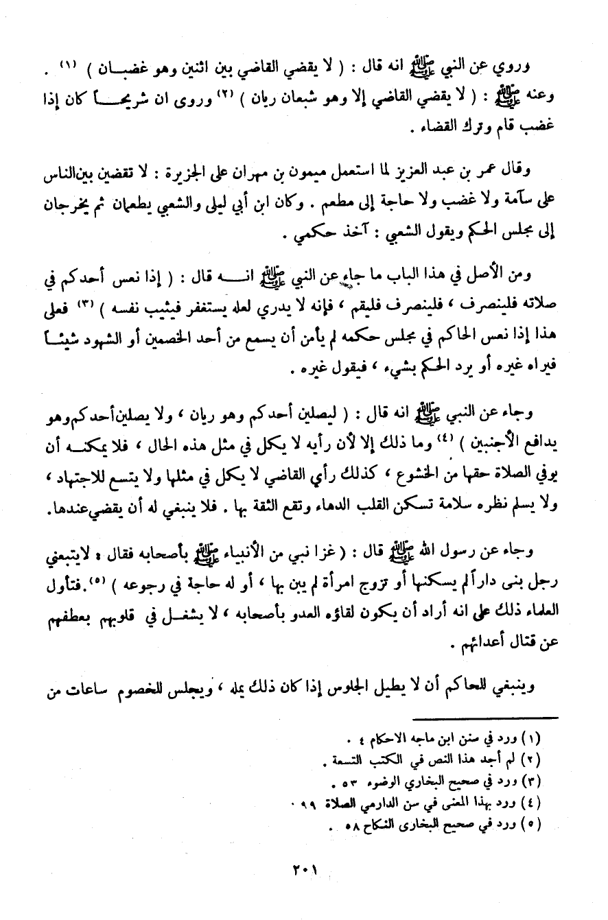 وروي عن النبي صلى الله عليه وسلم أنه قال: (لا يقضي القاضي بين اثنين وهو غضبان). وعنه صلى الله عليه وسلم: (لا يقضي القاضي إلا وهو شبعان ريان) وروى أن شريحًا كان إذا غضب قام وترك القضاء.