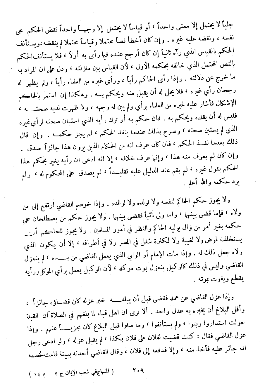 جليًا لا يحتمل إلا معنى واحدًا، أو قياسًا لا يحتمل إلا وجهًا واحدًا نقض الحكم على نفسه، ونقضه عليه غيره. وإن كان أخطأ نصًا محتملًا وقياسًا محتملًا لم ينقضه، ويستأنف الحكم بالقياس الذي رآه ثانيًا إن كان أرجح عنده فيما رأى به أولًا، فلا يستأنف الحكم بالنص المحتمل الذي خالفه بحكمه الأول، لأن القياس بين منزلته، ودل على أن المراد به ما خرج عن دلالته. وإذا رأى الحاكم رأيًا، ورأى غيره من العلماء رأيًا، ولم يظهر له رجحان رأي غيره، فلا يحل له أن يقبل منه ويحكم به. وهكذا إن استمر بالحاكم الإشكال فأشار عليه غيره من العلماء برأي ولم يبن له وجهه، ولا ظهرت لديه صحته، فليس له أن يقلده ويحكم به. فإن حكم به أو ترك رأيه الذي استبان صحته لرأي غيره الذي لم يستبن صحته، وصرح بذلك عندما ينفذ الحكم، لم يجز حكمه. وإن قال ذلك بعدما نفذ الحكم، فإن كان عرف أنه من الحكام الذين يرون هذا جائزًا صدق. وإن كان لم يعرف منه هذا، وإنما عرف خلافه، إلا أنه ادعى أن رأيه يغير بحكم هذا الحكم بقول غيره، لم يقم عند الدليل عليه تقليدًا، لم يصدق على المحكوم له، ولم يرد حكمه والله أعلم.