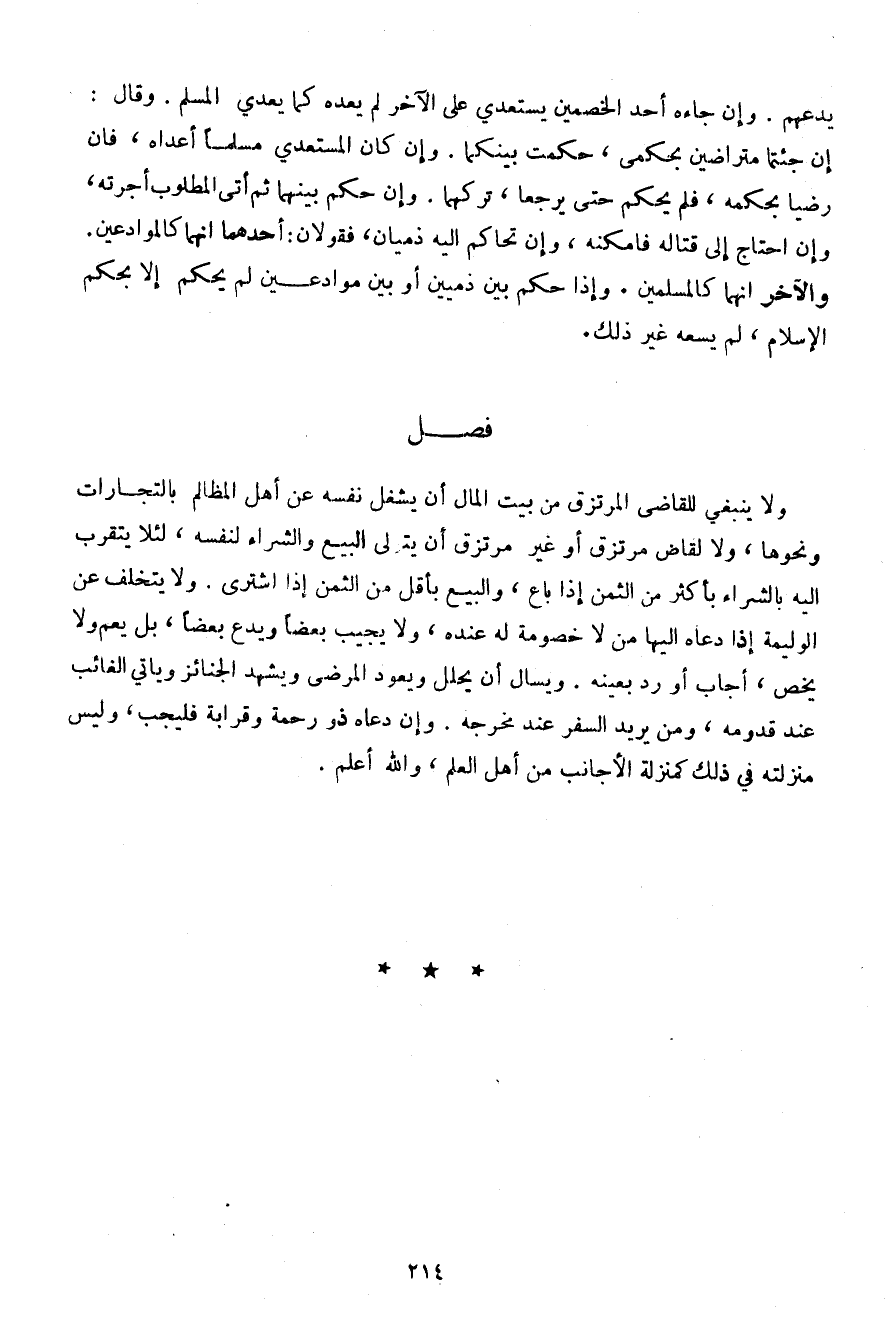 ولا ينبغي للقاضي المرتزق من بيت المال أن يشغل نفسه عن أهل المظالم بالتجارات ونحوها، ولا لقاض مرتزق أو غير مرتزق أن يتولى البيع والشراء لنفسه، لئلا يتقرب إليه بالشراء بأكثر من الثمن إذا باع، والبيع بأقل من الثمن إذا اشترى. ولا يتخلف عن الوليمة إذا دعاه إليها من لا خصومة له عنده، ولا يجيب بعضًا ويدع بعضًا، بل يعم ولا يخص، أجاب أو رد بعينه. ويسأل أن يحلل ويعود المرضى ويشهد الجنائز ويأتي الغائب عند قدومه، ومن يريد السفر عند مخرجه. وإن دعاه ذو رحمة وقرابة فليجب، وليس منزلته في ذلك كمنزلة الأجانب من أهل العلم، والله أعلم.