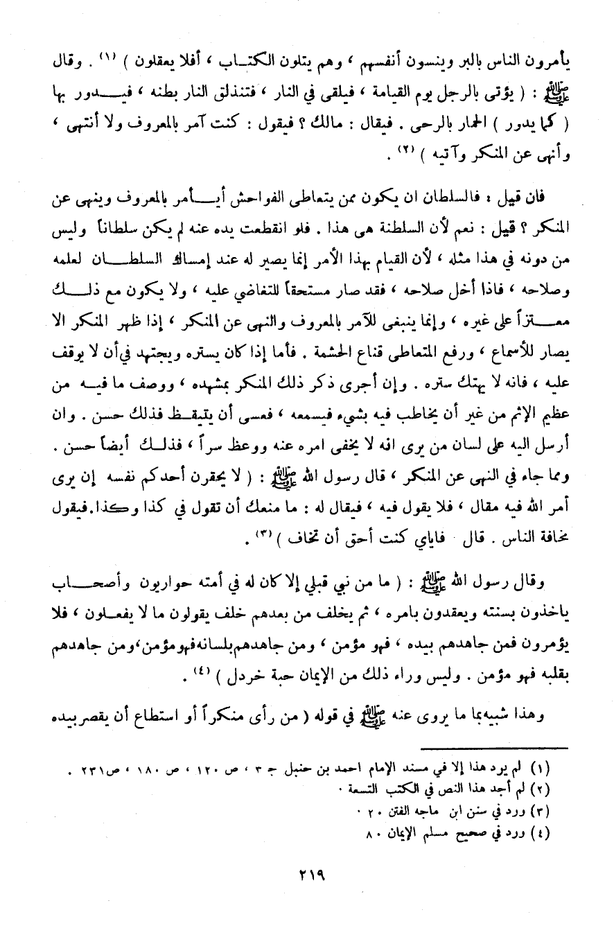 وقال رسول الله صلى الله عليه وسلم: (ما من نبي إلا كان له في أمته حواريون وأصحاب يأخذون بسنته ويعقدون بأمره، ثم يخلف من بعدهم خلف يقولون ما لا يفعلون، فلا يؤمرون فمن جاهدهم بيده، فهو مؤمن، ومن جاهدهم بلسانه فهو مؤمن، ومن جاهدهم بقلبه فهو مؤمن. وليس وراء ذلك من الإيمان حبة خردل).