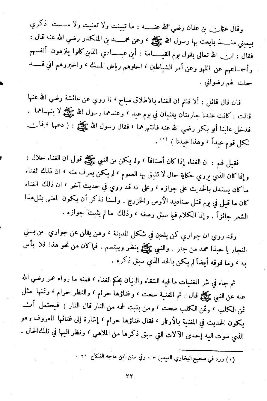 فقيل لهم: إن الغناء إذا كان أصنافا، ولم يكن من النبي صلى الله عليه وسلم قول أن الغناء حلال: وإنما كان الذي يروي حكاية حال لا تليق بها العموم، لم يكن يعرف منه، إن ذلك الغناء ما كان يستدل بالحديث على جوازه، وعلى أنه قد روى في حديث آخر، أن ذلك الغناء كان ما قيل في يوم قتل صناديد الأوس والخزرج. ولسنا نذكر أن يكون المعنى بمثل هذا الشعر جائزا. وإنما الكلام فيما سبق وصفه، وذلك ما لم يثبت جوازه.