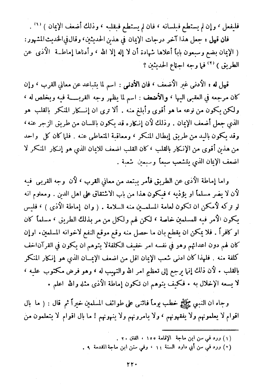 وأما إماطة الأذى عن طريق فأمر يبتعد من معاني القرب، لأن وجه القربى فيه لأن لا يضر مسلمًا أو يؤذيه، فيكون هذا من باب الاشتقاق على أهل الدين. ومعلوم أنه لو تركه لأمكن أن تكون لعامة المسلمين منه السلامة. (وأن إماطة الأذى)، فليس يكون الأمر فيه للمسلمين خاصة، لكن لهم ولكل من مر بذلك الطريق، مسلمًا كان أو كافرًا. فلا يمكن أن يقطع بأن ما حصل منه وقع موقع النفع لإخوانه المسلمين. أو إن كان لهم دون أعدائهم وهو في نفسه أمر خفيف الكلفة لا يتوهم أن يكون في القرآن أخف كلفة منه. فلهذا كان أدنى شعب الإيمان أقل من أضعف الإيمان الذي هو إنكار المنكر بالقلب. لأن ذلك إنما يرجع إلى تعظيم أمر الله والتهيب له، وهو فرض مكتوب عليه، لا يسعه الإخلال به. فكيف يتوهم أن تكون إماطة الأذى مثله والله أعلم.