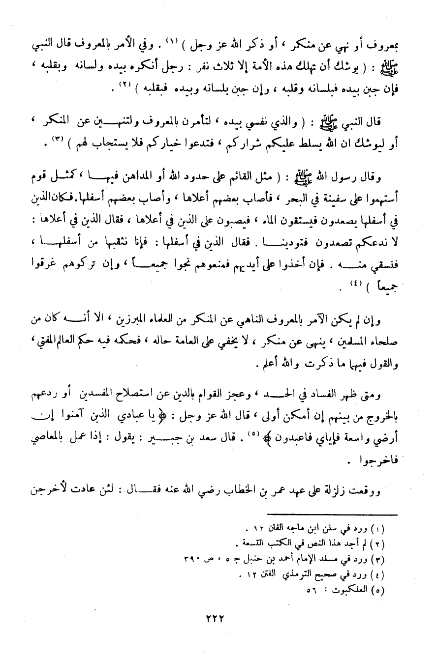 وقال رسول الله صلى الله عليه وسلم: (مثل القائم على حدود الله أو المداهن فيها، كمثل قوم أستهموا على سفينة في البحر، فأصاب بعضهم أعلاها، وأصاب بعضهم أسفلها. فكان الذين في أسفلها يصعدون فيستقون الماء، فيصبون على الذين في أعلاها، فقال الذين في أعلاها: لا ندعم تصعدون فتؤذينا. فقال الذين في أسفلها: فإنا نثقبها من أسفلها، فنسقي منه. فإن أخذوا على أيديهم فمنعوهم نجوا جميعًا، وإن تركوهم غرقوا جميعًا).