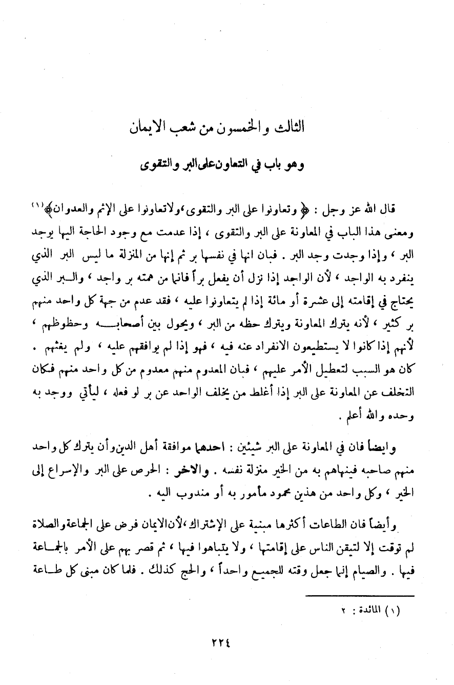 قال الله عز وجل: {وتعاونوا على البر والتقوى، ولا تعاونوا على الإثم والعدوان} ومعنى هذا الباب في المعاونة على البر والتقوى، إذا عدمت مع وجود الحاجة إليه يوجد البر، وإذا وجدت البر. فبان أنها في نفسها بر ثم إنها من المنزلة ما ليس البر الذي ينفرد به الواجد، لأن الواحد إذا نزل أن يفعل برًا فإنما من همته بر واجد، والبر الذي يحتاج في إقامته إلى عشرة أو مائة إذا لم يتعاونوا عليه، فقد عدم من جهة كل واحد منهم بر كثير، لأنه يترك المعاونة ويترك حظه من البر، ويحول بين أصحابه وحظوظهم، لأنهم إذا كانوا لا يستطيعون الانفراد عنه فيه، فهو إذا لم يوافقهم عليه، ولم يغثهم. كان هو السبب لتعطيل الأمر عليهم، فبان المعدوم منهم معدوم من كل واحد منهم فكان التخلف عن المعاونة على البر إذا أغلط من يخلف الواحد عن بر لو فعله، ليأتي ووجد به وحده والله أعلم.