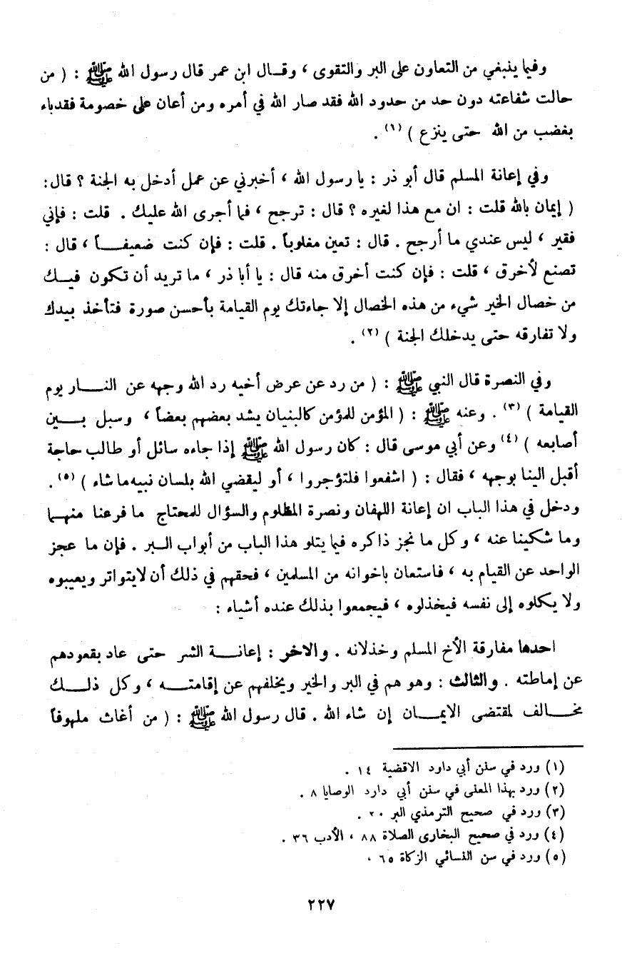 وفي النصرة قال النبي صلى الله عليه وسلم: (من رد عن عرض أخيه رد الله وجهه عن النار يوم القيامة). وعنه صلى الله عليه وسلم: (المؤمن للمؤمن كالبنيان يشد بعضهم بعضًا، وسبل بين أصابعه) وعن أبي موسى قال: كان رسول الله صلى الله عليه وسلم إذا جاءه سائل أو طالب حاجة أقبل إلينا بوجهه، فقال: (اشفعوا فلتؤجروا، أو ليقضي الله بلسان نبيه ما شاء). ودخل في هذا الباب إن إعانة اللهفان ونصرة المظلوم والسؤال للمحتاج ما فرعنا منهما وما شكينا عنه، وكل ما نجز ذاكره فيما يتلو هذا الباب من أبواب البر. فإن ما عجز الواحد عن القيام به، فاستعان بإخوانه من المسلمين، فحقهم في ذلك أن لا يتواتر ويعيبوه ولا يكلوه إلى نفسه فيخذلوه، فيجمعوا بذلك عنده أشياء: