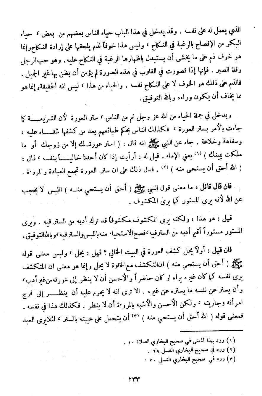 ويدخل في جملة الحياء من الله عز وجل ثم من الناس، ستر العورة لأن الشريعة كما جاءت بالأمر بستر العورة، فكذلك الناس بحكم طبائعهم يعد من كشفها شقاء عليه، وسفاهة خلاعة. جاء عن النبي صلى الله عليه وسلم أنه قال: (استر عورتك إلا من زوجك أو ما ملكت يمينك) يعني الإماء. قيل له: أرأيت إذا كان أحدنا خاليًا بنفسه، قال: (الله أحق أن يستحى منه). فدل ذلك على أن ستر العورة تجمع العبادة والمروءة.