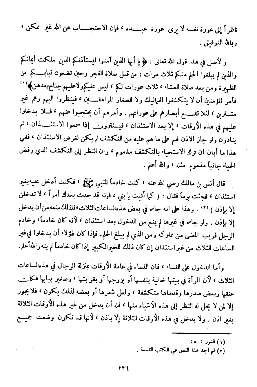 قال أنس بن مالك رضي الله عنه، كنت خادمًا للنبي صلى الله عليه وسلم، فكنت أدخل عليه بغير استئذان، فجئت يومًا فقال: (كما أتيتني يا بني، فإنه قد حدث بعدك أمرًا، لا تدخلن إلا بإذن). وهذا على أنه جاءه في بعض هذه الساعات الثلاث، فلذلك منعه من أن يدخل إلا بإذن. ولو جاءه في غيرها لم يمنع من الدخول بعد استئذان، لأنه كان خادمًا، وخادم الرجل قريب المعنى من مملوكه ومن الذي لم يبلغ الحلم. فإذا كان لهؤلاء أن يدخلوا في غير الساعات الثلاث من غير استئذان إن كان ذلك للخير الكبير إذا كان خادمًا لم ينه والله أعلم.