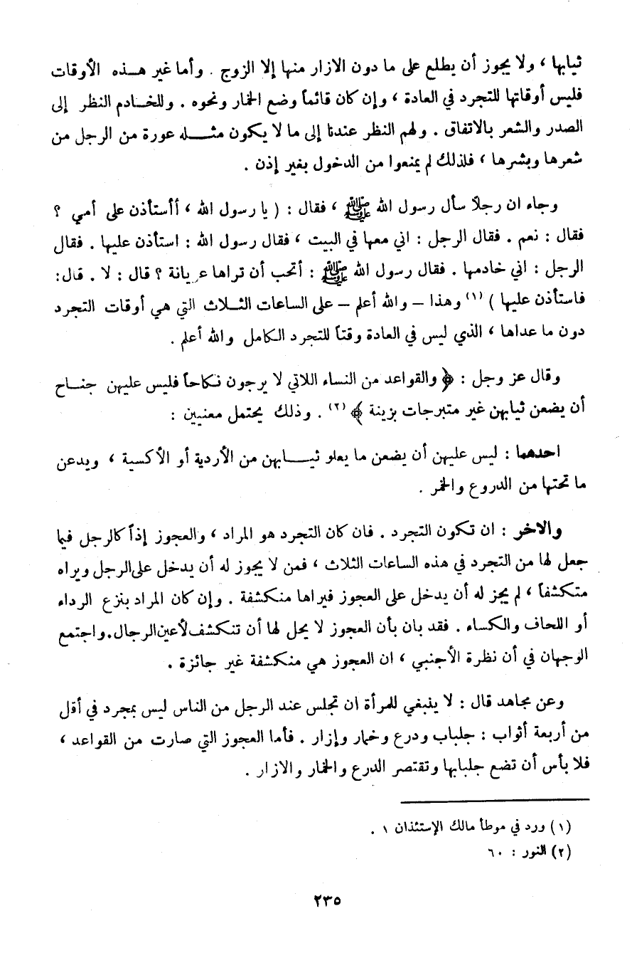 والآخر: أن تكون التجرد. فإن كان التجرد هو المراد، والعجوز إذًا كالرجل فيما جعل لها من التجرد في هذه الساعات الثلاث، فمن لا يجوز له أن يدخل على الرجل ويراه متكشفًا، لم يجز له أن يدخل على العجوز فيراها منكشفة. وإن كان المراد بنزع الرداء أو اللحاف والكساء. فقد بان بأن العجوز لا يحل لها أن تنكشف لأعين الرجال. واجتمع الوجهان في أن نظرة الأجنبي، أن العجوز هي منكشفة غير جائزة.