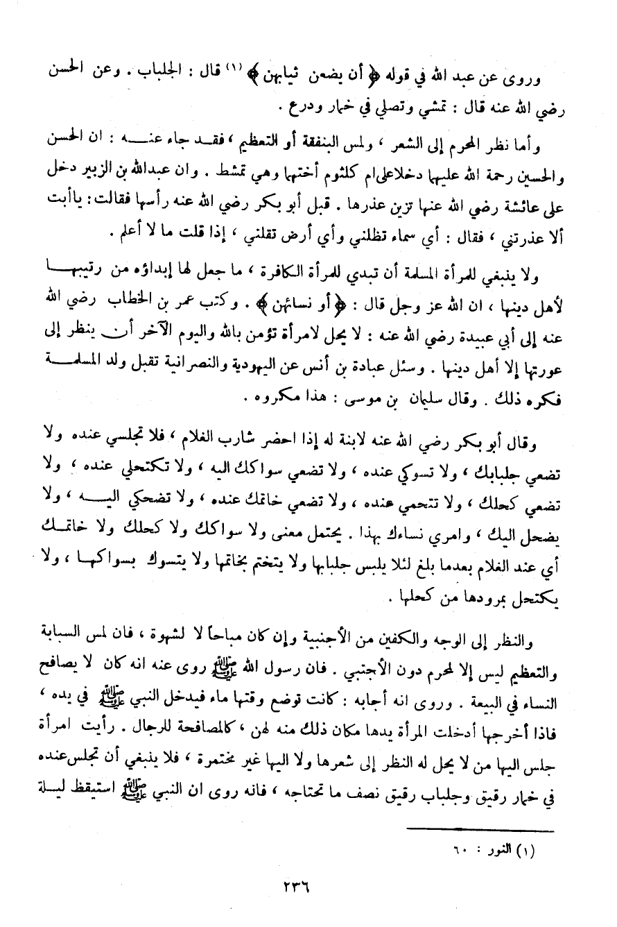 والنظر إلى الوجه والكفين من الأجنبية وإن كان مباحًا لا لشهوة، فإن لمس السبابة والتعظيم ليس إلا لمحرم دون الأجنبي. فإن رسول الله صلى الله عليه وسلم روى عنه أنه كان لا يصافح النساء في البيعة. وروى أنه أجابه: كانت توضع وقتها ماء فيدخل النبي صلى الله عليه وسلم في يده، فإذا أخرجها أدخلت المرأة يدها مكان ذلك منه لهن، كالمصافحة للرجال. رأيت امرأة جلس إليها من لا يحل له النظر إلى شعرها ولا إليها غير مختمرة، فلا ينبغي أن تجلس عنده في خمار رقيق وجلباب رقيق ما تحتاجه، فإنه روى أن النبي صلى الله عليه وسلم استيقظ ليلة