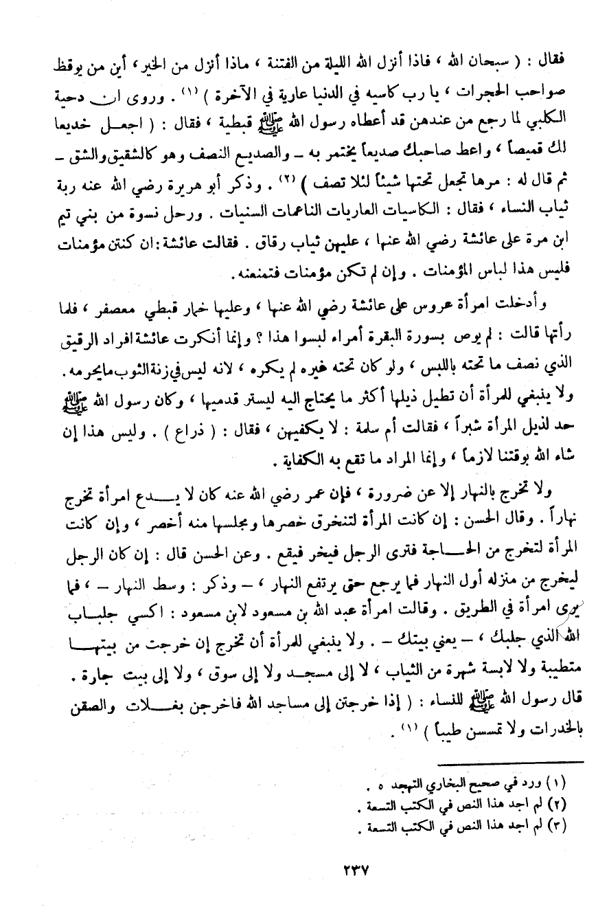 فقال: (سبحان الله، فإذا أنزل الله الليلة من الفتنة، ماذا أنزل من الخير، أين من يوقظ صواحب الحجرات، يا رب كاسيه في الدنيا عارية في الآخرة). وروى أن دحية الكلبي لما رجع من عندهن قد أعطاه رسول الله صلى الله عليه وسلم قبطية، فقال: (اجعل خديعًا لك قميصًا، واعط صاحبك صديعًا يختمر به- والصديع النصف وهو كالشقيق والشق- ثم قال له: مرها تجعل تحتها شيئًا لئلا تصف). وذكر أبو هريرة رضي الله عنه ربة ثياب النساء، فقال: الكاسيات العاريات الناعمات السنيات. ورحل نسوة من بني تيم ابن مرة على عائشة رضي الله عنها، عليهن ثياب رقيقة. فقال عائشة: إن كنتن مؤمنات فليس هذا لباس المؤمنات. وإن لم تكن مؤمنات فتمنعنه.