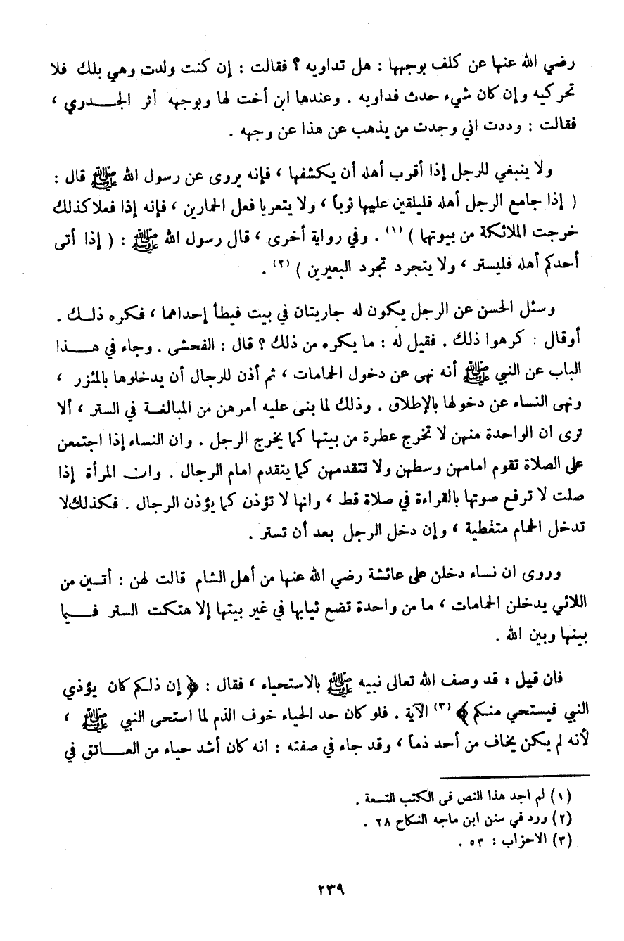 وسئل الحسن عن الرجل يكون له جاريتان في بيت فيطأ إحداهما، فكره ذلك. أو قال: كرهوا ذلك. فقيل له: ما يكره من ذلك؟ قال: الفحشى. وجاء في هذا الباب عن النبي صلى الله عليه وسلم أنه نهى عن دخول الحمامات، ثم أذن للرجل أن يدخلوها بالمئزر، ونهى النساء عن دخولها بالإطلاق. وذلك لما بنى عليه أمرهن من المبالغة في الستر، ألا ترى أن الواحدة منهن لا تخرج عطرة من بيتها كما يخرج الرجل. وأن النساء إذا اجتمعن على الصلاة تقوم أمامهن وسطهن ولا تتقدمهن كما يتقدم أمام الرجال. وأن المرأة إذا صلت لا ترفع صوتها بالقراءة في صلاة قط، وإنها لا تؤذن كما يؤذن الرجال. فكذلك لا تدخل الحمام متغطية، وإن دخل الرجل بعد أن تستر.