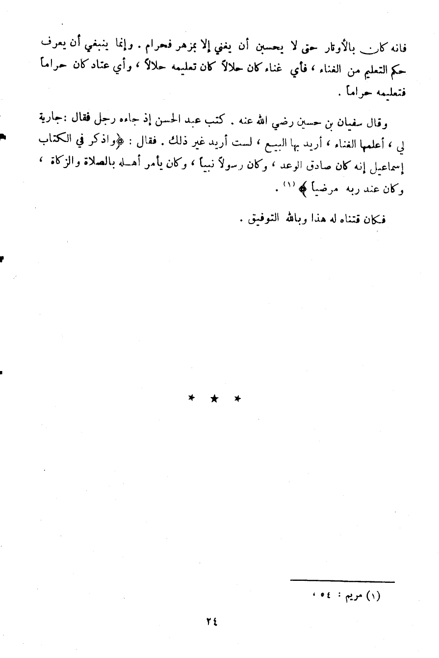 وقال سفيان بن حسين رضي الله عنه. كتب عبد الحسن إذ جاءه رجل فقال: جارية لي، أعملها الغناء، أريد بها البيع، لست أريد غير ذلك، فقال:} واذكر في الكتاب إسماعيل أنه كان صادق الوعد، وكان رسولا نبيا، وكان يأمر أهله بالصلاة والزكاة، وكان عند ربه مرضيا {.