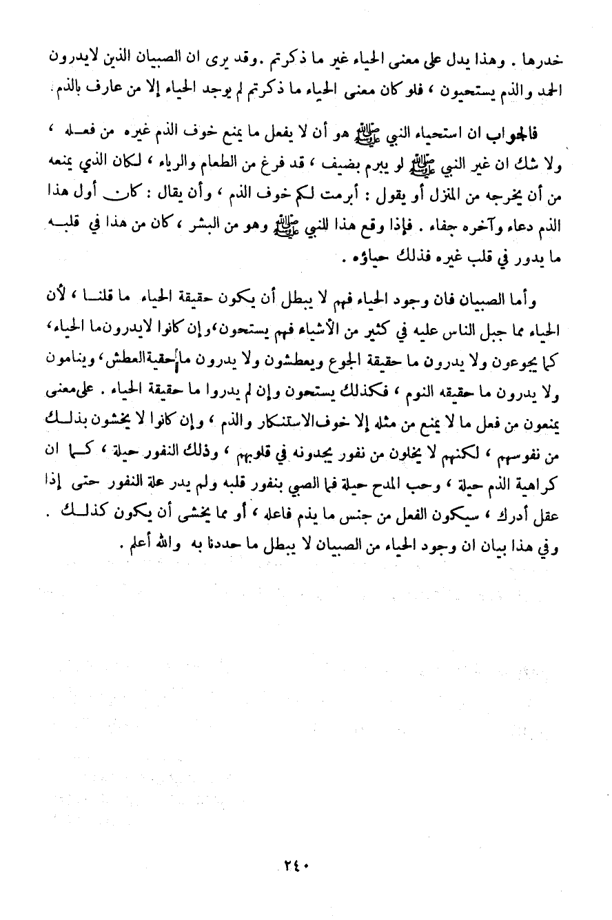 وأما الصبيان فإن وجود الحياء فهم لا يبطل أن يكون حقيقة الحياء ما قلنا، لأن الحياء ما جبل الناس عليه في كثير من الأشياء فهم يستحون، وإن كانوا لا يدرون ما الحياء، كما يجوعون ولا يدرون ما حقيقة الجوع ويعطشون ولا يدرون ما أحقية العطش، وينامون ولا يدرون ما حقيقة النوم، فكذلك يستحون وإن لم يدروا ما حقيقة الحياء. على معنى يمنعون من فعل ما لا يمنع من مثله إلا خوف الاستنكار والذم، وإن كانوا لا يخشون بذلك من نفوسهم، لكنهم لا يخلون من نفور يجدونه في قلوبهم، وذلك النفور حيلة، كما أن كراهية الذم حيلة، وحب المدح حيلة فما الصبي بنفور قلبه ولم يدر علة النفور حتى إذا عقل أدرك، سيكون الفعل من جنس ما يذم فاعله، أو ما يخشى أن يكون كذلك. وفي هذا بيان أن وجود الحياء من الصبيان لا يبطل ما حددنا به والله أعلم.