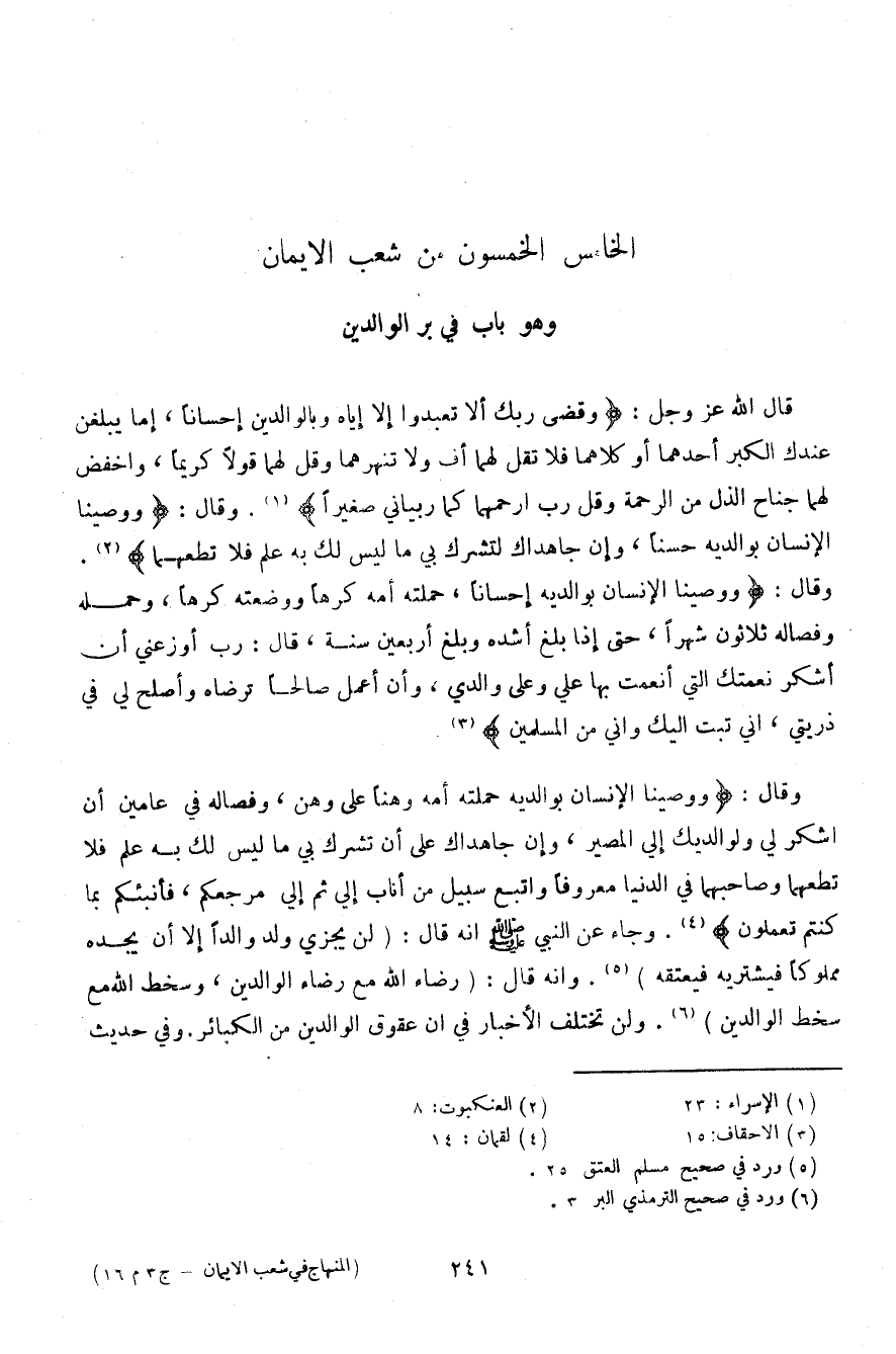 وقال: {ووصينا الإنسان بوالديه حملته أمه وهنًا على وهن، وفصاله في عامين أن اشكر لي ولوالدي إلي المصير، وإن جاهداك على أن تشرك بي ما ليس لك به علم فلا تطعهما وصاحبهما في الدنيا معروفًا واتبع سبيل من أناب إلي ثم إلي مرجعكم، فأنبئكم بما كنتم تعملون}. وجاء عن النبي صلى الله عليه وسلم أنه قال: (لئن يجزي ولد والدًا إلا أن يجده مملوكًا فيشتريه فيعتقه). وإنه قال: (رضاء الله مع رضاء الوالدين، وسخط الله مع سخط الوالدين). ولن تختلف الأخبار في أن عقوق الوالدين من الكبائر. وفي حديث
