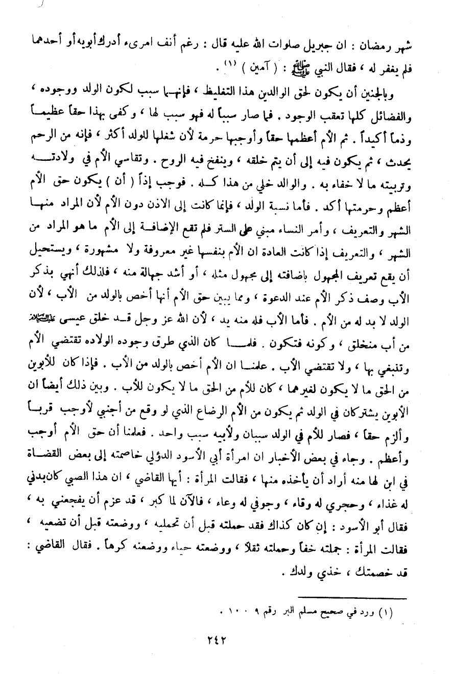 وبالجنين أن يكون لحق الوالدين هذا التغليظ، فإنهما سبب لكون الولد ووجوده، والفضائل كلها تعقب الوجود. فما صار سببًا له فهو سبب لها، وكفى بهذا حقًا عظيمًا وذمًا أكيدًا. ثم الأم أعظمها حقًا وأوجبها حرمة لأن شغلها للولد أكثر، فإنه من الرحم يحدث، ثم يكون فيه إلى أن يتم خلقه، وينفخ فيه الروح. وتقاسي الأم في ولادته وتربيته ما لا خفاء به. والوالد خلي هذا كله. فوجب إذًا (أن يكون حق الأم أعظم وحرمتها أكد. فأما نسبة الولد، فإنما كانت إلى الأذن دون الأم لأن المراد منها الشهر والتعريف، وأمر النساء مبني على الستر فلم تقع الإضافة إلى الأم ما هو المراد من الشهر، والتعريف إذا كانت العادة أن الأم بنفسها غير معروفة ولا مشهورة، ويستحيل أن يقع تعريف المجهول بإضافته إلى مجهول مثله، أو أشد جهالة منه، فلذلك أنهي بذكر الأب وصف ذكر الأم عند الدعوة، ومما يبين حق الأم أنها أخص بالولد من الأب، لأن الولد لابد له من الأم. فأما الأب فله منه يد، لأن الله عز وجل قد خلق عيسى عليه السلام من أب منخلق، وكونه فتكون. فلما كان الذي طرق وجوده الولادة تقتضي الأم وتنبغي بها، ولا تقتضي الأب. علمنا أن الأم أخص بالولد من الأب. فإذا كان للأبوين من الحق ما لا يكون لغيرهما، كان للأم من الحق ما لا يكون للأب. وبين ذلك أيضًا أن الأبوين يشتركان في الولد ثم يكون من الأم الرضاع الذي لو وقع من أجنبي لأوجب قربًا وألزم حقًا، فصار للأم في الولد سببان ولأبيه سبب واحد. فعلمنا أن حق الأم أوجب وأعظم. وجاء في بعض الأخبار أن امرأة أبي الأسود الدؤلي خاصمته إلى بعض القضاة في ابن لها منه أراد أن يأخذه منها، فقالت المرأة: أيها القاضي، إن هذا الصبي كان بدني له غذاء، وحجري له وقاء، وجوفي له وعاء، فالآن لما كبر، قد عزم أن يفجعني به، فقال أبو الأسود: إن كان كذاك فقد حملته قبل أن تحمليه، ووضعته قبل أن تضعيه، فقالت المرأة: حملته خفًا وحملته ثقلًا، ووضعته حياء ووضعته كرهًا. فقال القاضي: قد خصمتك، خذي ولدك.
