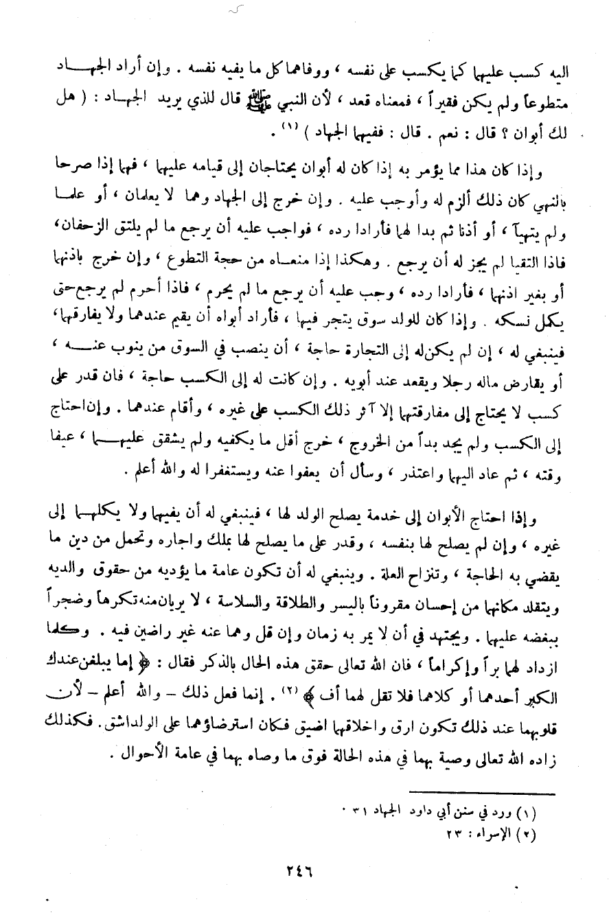 إليه كسب عليهما كما يكسب على نفسه، ووفاهما كل ما يفيه نفسه. وإن أراد الجهاد متطوعًا ولم يكن فقيرًا، فمعناه قعد، لأن النبي صلى الله عليه وسلم قال للذي يريد الجهاد: (هل لك أبوان؟ قال: نعم. قال: ففيهما الجهاد).