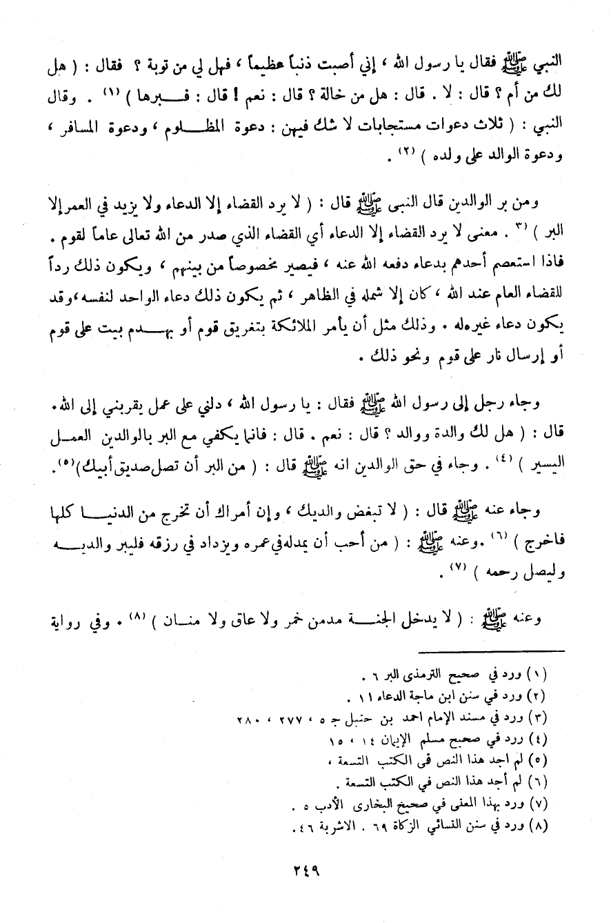 النبي صلى الله عليه وسلم فقال يا رسول الله، إني أصبت ذنبًا عظيمًا، فهل لي من توبة؟ فقال: (هل لك من أم؟ قال: لا. قال: هل من خالة؟ قال: نعم! قال: فبرها). وقال النبي: (ثلاث دعوات مستجابات لا شك فيهن: دعوة المظلوم، ودعوة المسافر، ودعوة الوالد على ولده).