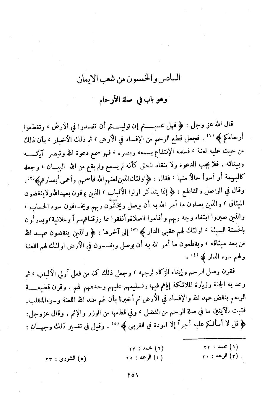قال الله عز وجل: {فهل عسيتم إن توليتم أن تفسدوا في الأرض، وتقطعوا أرحامكم}. فجعل قطع الرحم من الإفساد في الأرض، ثم ذلك الأخبار، بأن ذلك من حيث عليه لعنة، الانتفاع بسمعه وبصره، فهو سمع دعوة الله وتبصر آياته وبياناته. فلا يجب الدعوة ولا ينقاد للحق كأنه لم يسمع ولم يقع من الله البيان، وجعله كالبهيمة أو أسوأ حالًا منها، فقال: {أولئك الذين لعنهم الله فأصمهم وأعمى أبصارهم. وقال في الواصل والقاطع: {إنما يتذكر أولوا الألباب، الذين يوفون بعهد الله ولا ينقضون الميثاق، والذين يصلوا ما أمر الله به أن يوصل ويخشون ربهم ويخافون سوء الحساب، والذين صبروا ابتغاء وجه ربهم وأقاموا الصلاة وأنفقوا مما رزقناهم سرًا وعلانية، ويدرأون بالحسنة السيئة، أولئك لهم عقبى الدار} إلى آخرها: {والذين ينقضون عهد الله من بعد ميثاقه، ويقطعون ما أمر الله به أن يوصل ويفسدون في الأرض أولئك لهم اللعنة ولهم سوء الدار}.