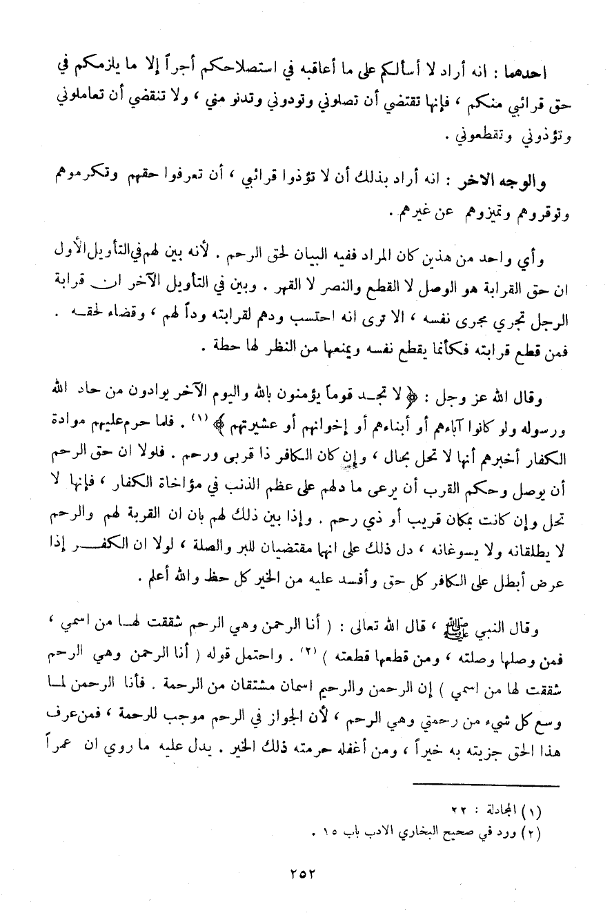 وأي واحد من هذين كان المراد ففيه البيان لحق الرحم. لأن بين لهم في التأويل الأول أن حق القرابة هو الوصل لا القطع والنصر لا القهر. وبين في التأويل الآخر أن قرابة الرجل تجري مجرى نفسه، ألا ترى أنه احتسب ودهم لقرابته ودًا لهم، وقضاء لحقه. فمن قطع قرابته فكأنما يقطع نفسه ويمنعه من النظر لها حطة.