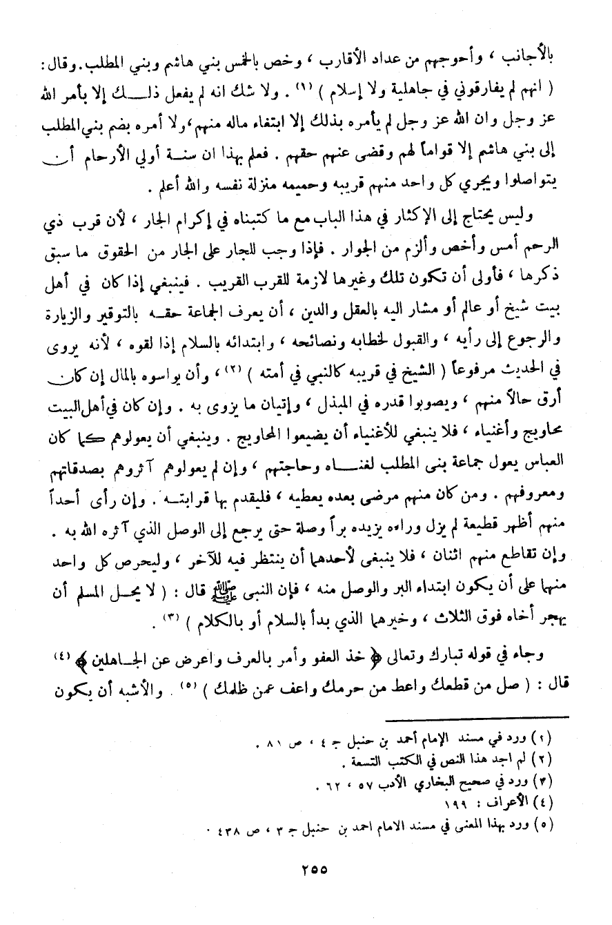 بالأجانب، وأحوجهم من عداد الأقارب، وخص بالخمس بني هاشم وبني المطلب. وقال: (أنهم لم يفارقوني في جاهلية ولا إسلام). ولا شك أنه لم يفعل ذلك إلا بأمر الله عز وجل وأن الله عز وجل لم يأمره بذلك إلا ابتغاء ماله منهم، ولا أمره بضم بني المطلب إلى بني هاشم إلا قوامًا لهم وقضى عنهم حقهم. فعلم بهذا أن سنة أولي الأرحام أن يتواصلوا ويجري كل واحد منهم قريبة وحميمه منزلة نفسه والله أعلم.