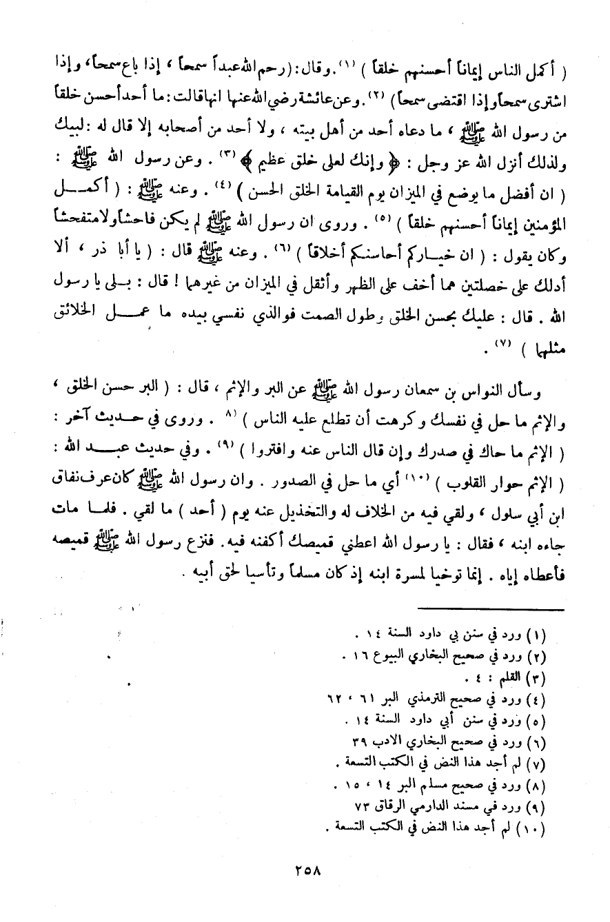 (أكمل الناس إيمانًا أحسنهم خلقًا). وقال: (رحم الله عبدًا سمحًا، إذا باع سمحًا، وإذا اشترى سمحًا وإذا اقتضى سمحًا). وعن عائشة رضي الله عنها أنها قالت: ما أحد أحسن خلقًا من رسول الله صلى الله عليه وسلم، ما دعاه أحد من أهل بيته، ولا أحد من أصحابه إلا قال له: لبيك ولذلك أنزل الله عز وجل: {وإنك لعلى خلق عظيم}. وعن رسول الله صلى الله عليه وسلم: (إن أفضل ما يوضع في الميزان يوم القيامة الخلق الحسن). وعنه صلى الله عليه وسلم: (أكمل المؤمنين إيمانًا أحسنهم خلقًا). وروى أن رسول الله صلى الله عليه وسلم لم يكن فاحشًا ولا متفحشًا وكان يقول: (إن خياركم أحاسنكم أخلاقًا). وعنه صلى الله عليه وسلم: (يا أبا ذر، ألا أدلك على خصلتين هما أخف على الظهر وأثقل في الميزان من غيرهما! قال: بلى يا رسول الله. قال: عليك بحسن الخلق وطول الصمت فوالذي نفسي بيده ما عمل الخلائق مثلهما).