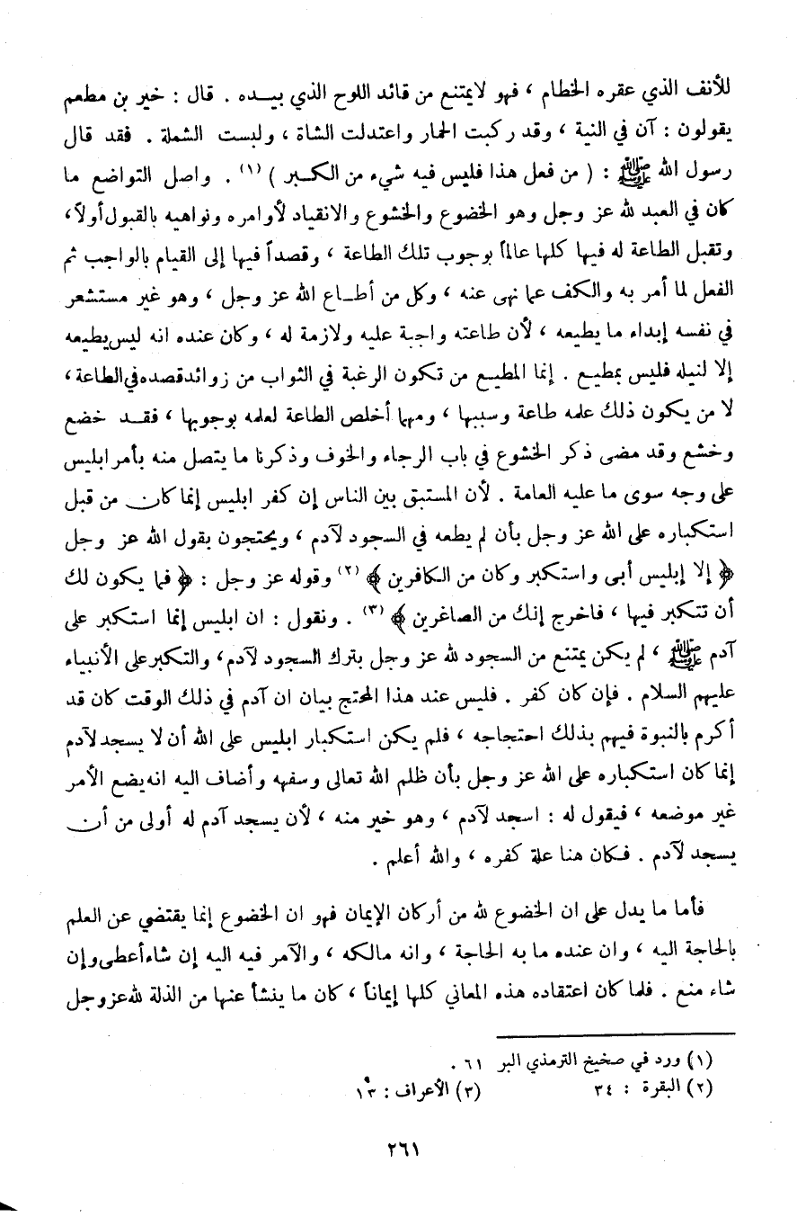 للأنف الذي عقره الخطام، فهو لا يمتنع من قائد اللوح الذي بيده. قال: خير بن مطعم يقول: آن في النية، وقد ركبت الحمار واعتدلت الشاة، ولبست الشملة. فقد قال رسول الله صلى الله عليه وسلم: (من فعل هذا فليس فيه شيء من الكبر). واصل التواضع ما كان في العبد لله عز وجل وهو الخضوع والخشوع والانقياد لأوامره ونواهيه بالقبول أولًا، وتقبل الطاعة له فيها كلها عالمًا بوجوب تلك الطاعة، وقصدًا فيها إلى القيام بالواجب ثم الفعل لما امر به والكف عما نهى عنه، وكل من أطاع الله عز وجل، وهو غير مستشعر في نفسه إبداء ما يطيعه، لأن طاعته واجبة عليه ولازمة له، وكان عنده أنه ليس يطيعه إلا لنيله فليس بمطيع. إنما المطيع من تكون الرغبة في الثواب من زوائد قصده في الطاعة، لا من يكون ذلك علمه طاعة وسببًا، ومهما أخلص الطاعة لعلمه بوجوبها، فقد خضع وخشع وقد مضى ذكر الخشوع في باب الرجاء والخوف وذكرنا ما يتصل منه بأمر إبليس على وجه سوى ما عليه العامة. لأن المستبق بين الناس إن كفر إبليس إنما كان من قبل استكباره على الله عز وجل بأن لم يطعه في السجود لآدم، ويحتجون بقول الله عز وجل {إلا إبليس أبى واستكبر وكان من الكافرين} وقوله عز وجل: {فما يكون لك أن تتكبر فيها، فأخرج إنك من الصاغرين}. ونقول: إبليس إنما استكبر على آدم صلى الله عليه وسلم، لم يكن يمتنع من السجود لله عز وجل بترك السجود لآدم، والتكبر على الأنبياء عليهم السلام. فإن كان كفر. فليس عند هذا المحتج بيان أن آدم في ذلك الوقت كان قد أكرم بالنبوة فيهم بذلك احتجاجه، فلم يكن استكبار إبليس على الله أن لا يسجد لآدم إنما كان استكباره على الله عز وجل بأن ظلم الله تعالى وسفهه وأضاف إليه أنه يضع الأمر غير موضعه، فيقول له: اسجد لآدم، وهو خير منه، لأن يسجد آدم له أولى من أن يسجد لآدم. فكان هنا علة كفره، والله أعلم.
