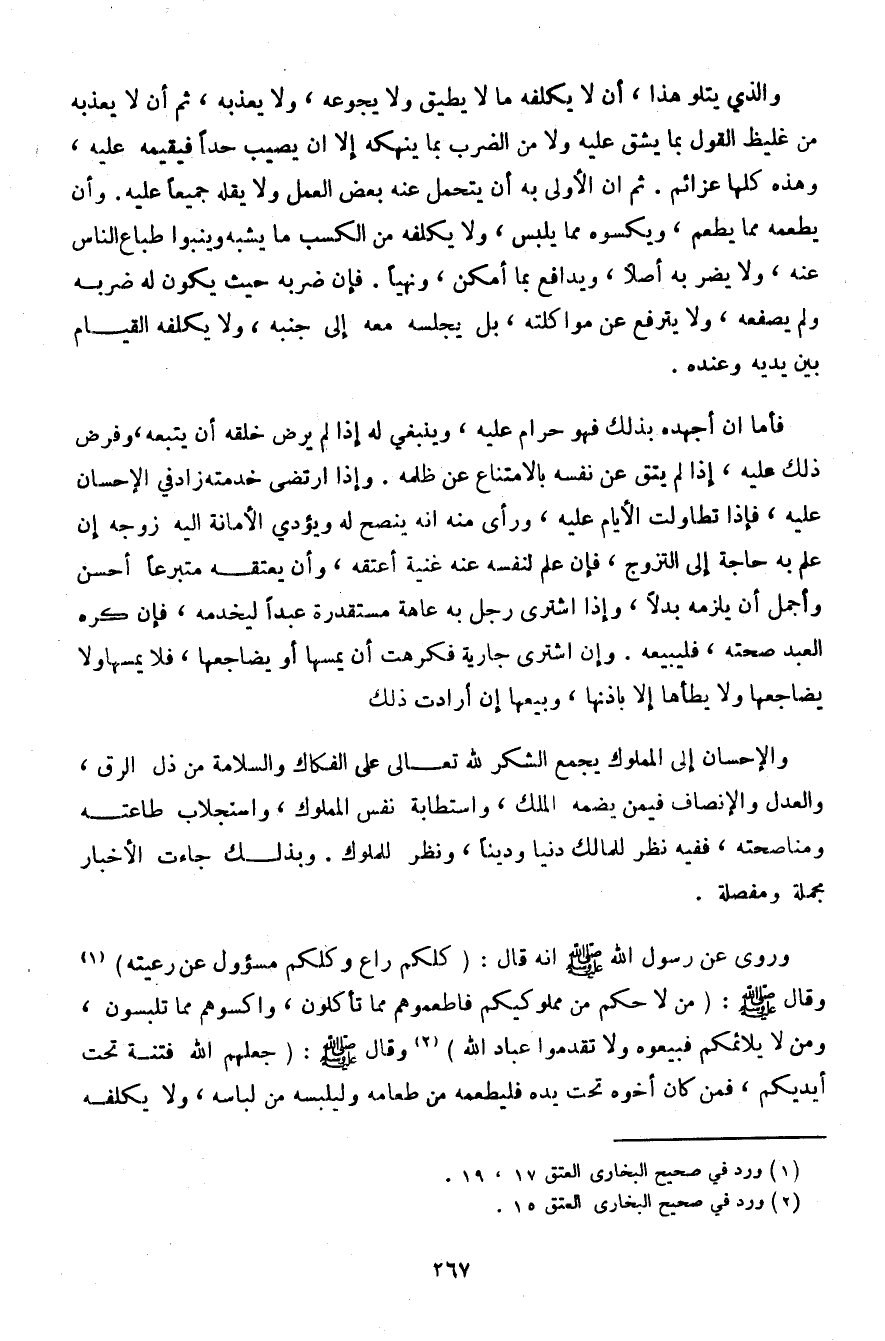 وروى عن رسول الله صلى الله عليه وسلم أنه قال: (كلكم راع وكلكم مسئول عن رعيته) وقال صلى الله عليه وسلم: (من لا حكم من مملوكيكم فاطعموهم مما تأكلون، واكسوهم مما تلبسون، ومن لا يلائمكم فبيعوه ولا تقدموا عباد الله) وقال صلى الله عليه وسلم: (جعلهم الله فتنة تحت أيديكم، فمن كان أخوه تحت يده فليطعمه من طعامه وليلبسه من لباسه، ولا يكلفه