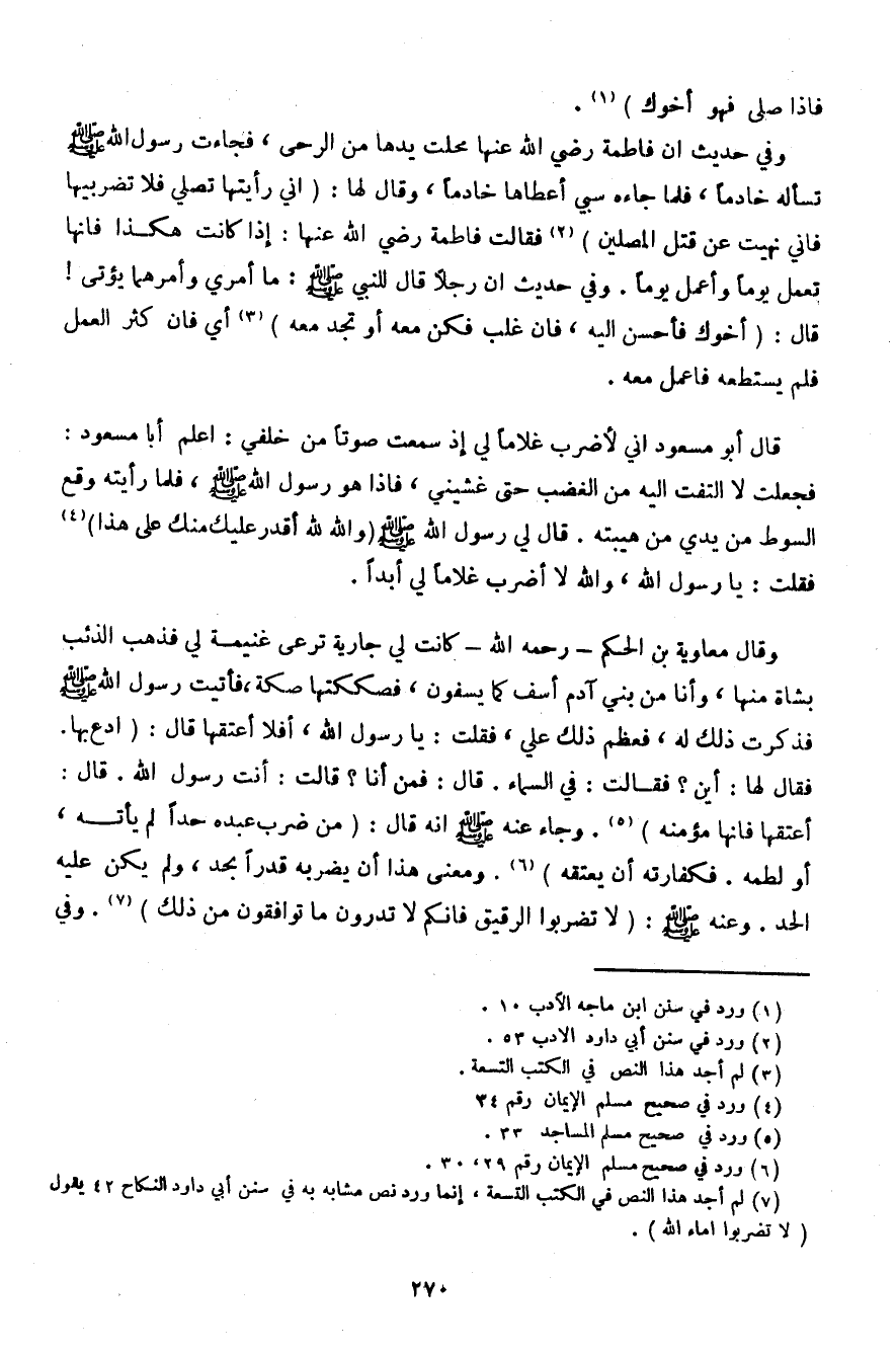 وقال معاوية بن الحكم- رحمه الله- كانت لي جارية ترعى غنيمة لي فذهب الذئب بشاة منها، وأنا من بني آدم أسف كما يسفون، فصككتها صكة، فأتيت رسول الله صلى الله عليه وسلم فذكرت ذلك له، فعظم ذلك علي، فقلت: يا رسول الله، أفلا أعتقها قال: (ادع بها. فقال لها: أين؟ فقالت: في السماء. قال: فمن أنا؟ قالت: أنت رسول الله. قال: أعتقها فإنها مؤمنة). وجاء عنه صلى الله عليه وسلم أنه قال: (من ضرب عبده حدًا لم يأته، أو لطمه. فكفارته أن يعتقه). ومعنى هذا أن يضربه قدرًا بحد، ولم يكن عليه الحد. وعنه صلى الله عليه وسلم: (لا تضربوا الرقيق فإنكم لا تدرون ما توافقون من ذلك). وفي